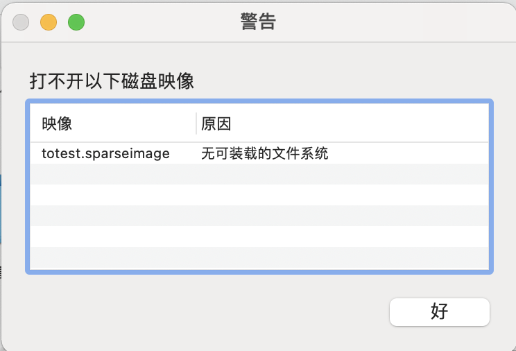 sparseimage 位于NAS上时无论通过SMB协议还是AFP协议加载,都会提示“无可装载的文件系统”。该问题自macos11.5开始出现,11.5.1和11.5.2时无论镜像位于本地还是原创均会提示“无可装载的文件系统”。更新至11.6后可在本地加载。通过虚拟机加载11.4后则原创与本地均可加载。原创NAS包括群晖及AirPort Time Capsule