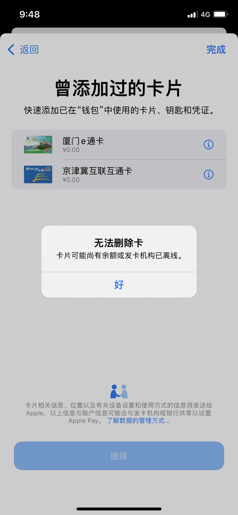 卡内没有余额,且为不同的公交卡(厦门e卡通和京津冀互联互通卡)皆不可删除卡。