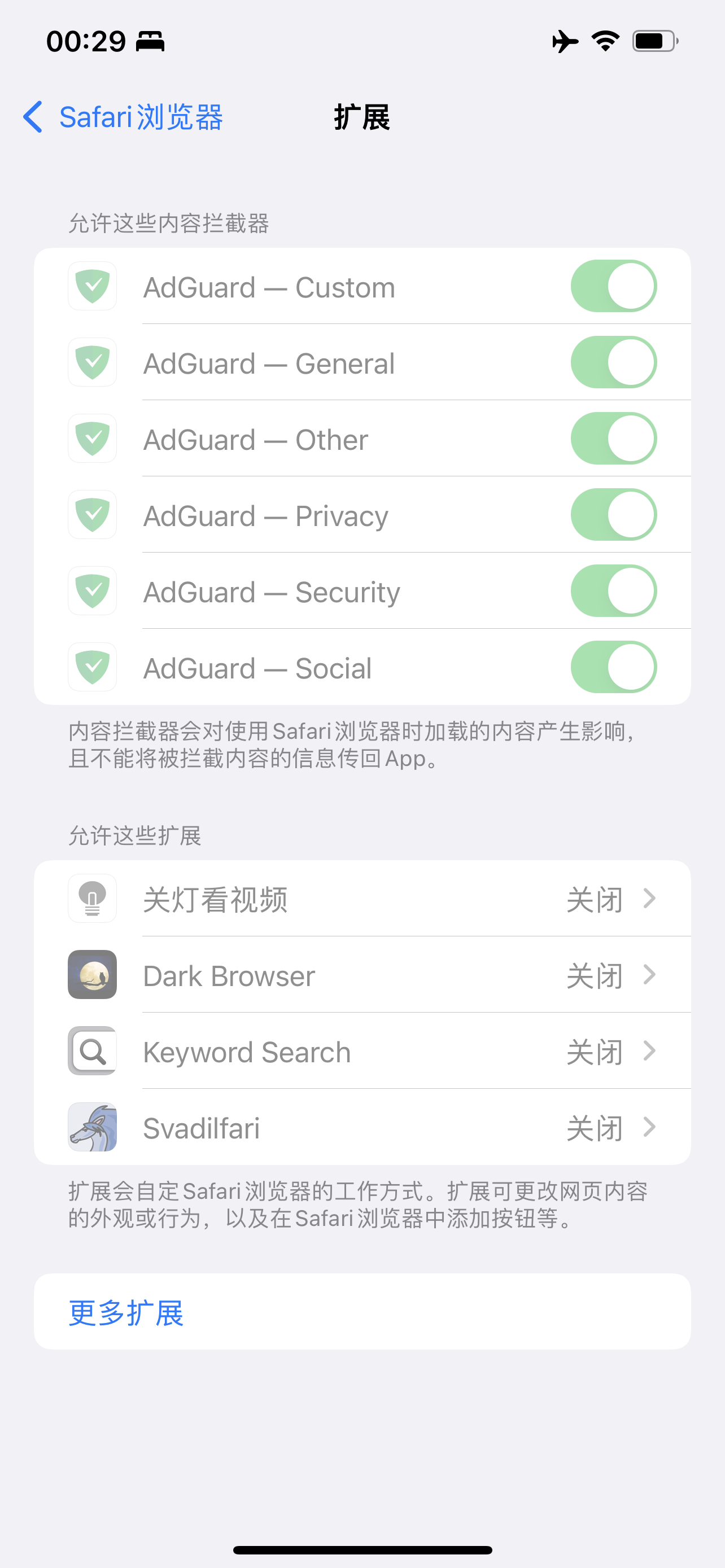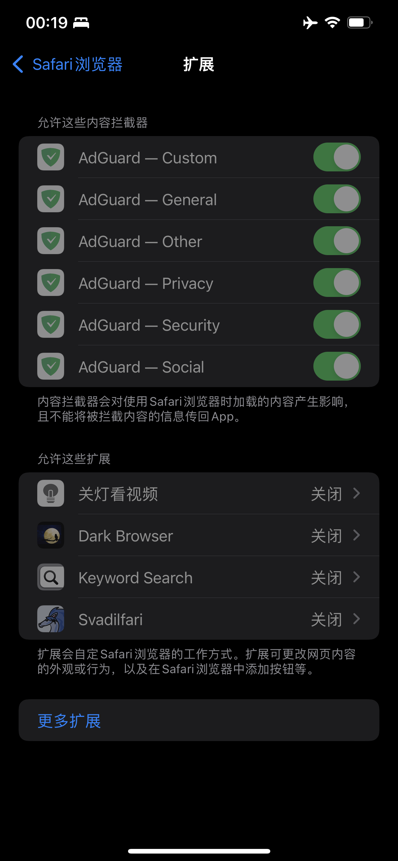 iPhone12PM更新ios15后设置-Safari浏览器-扩展内“内容拦截器”与“扩展”均为灰色,无法修改,“扩展”无法开启。