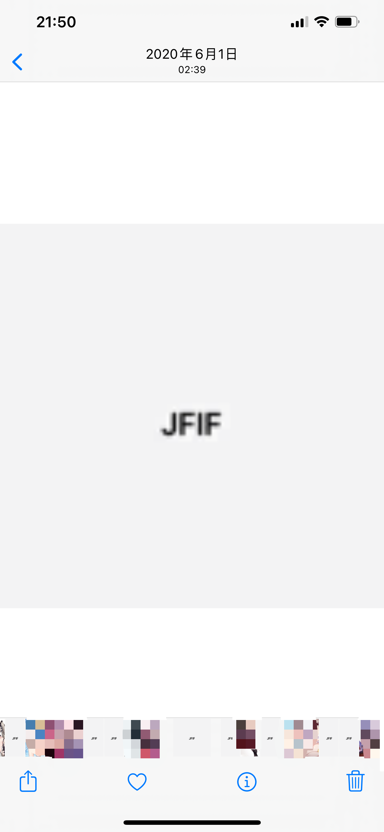 缩略图显示就是 JFIF 四个字母,图片点击打开也是一样。 可以删除,没有“编辑”按钮。只要点击“分享”,照片 APP 就直接崩溃退出。