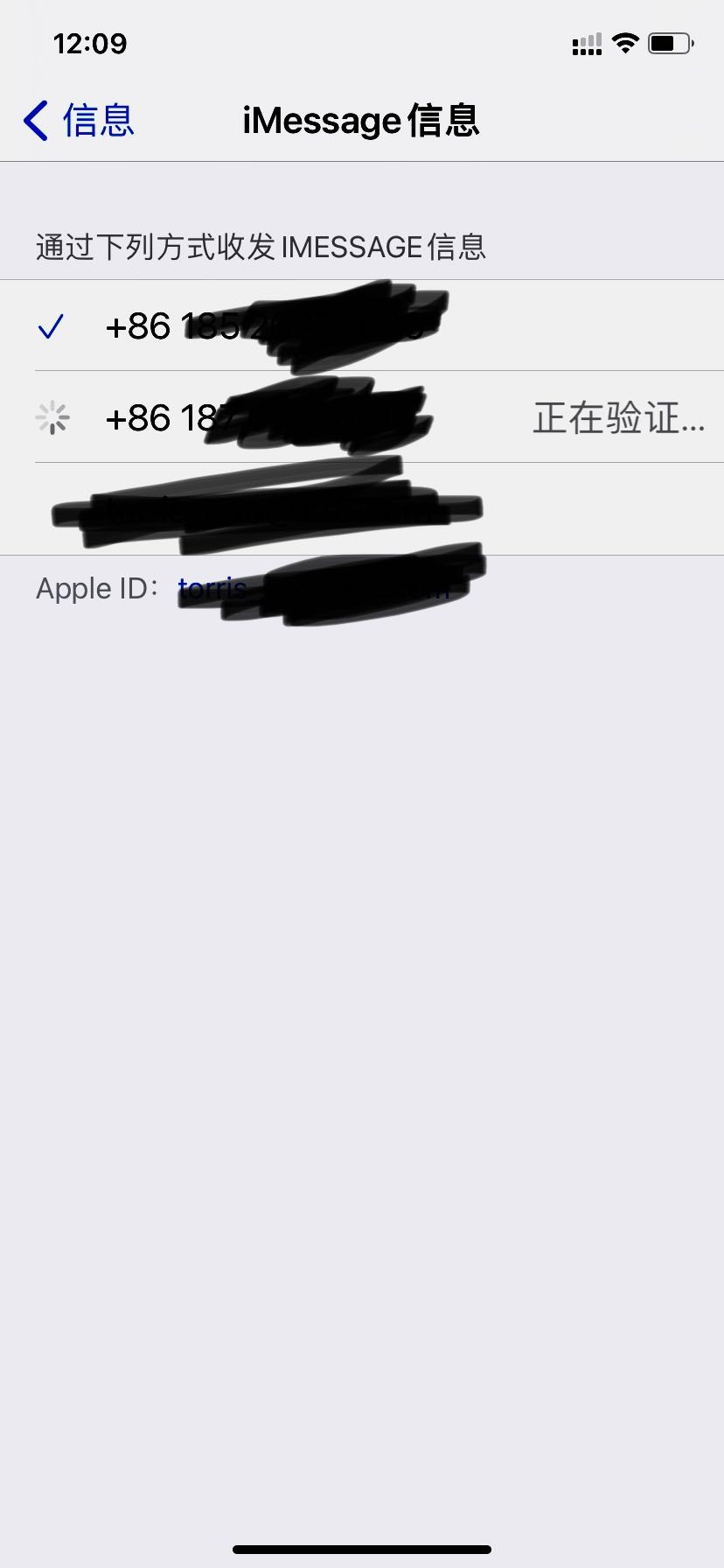 我也有此问题,最早是因为副卡发不出信息。我就一点点的查后来发现是imessage中没有添加副卡,于是我添加了副卡手机号码,然后号码后面就一直显示正在验证。
