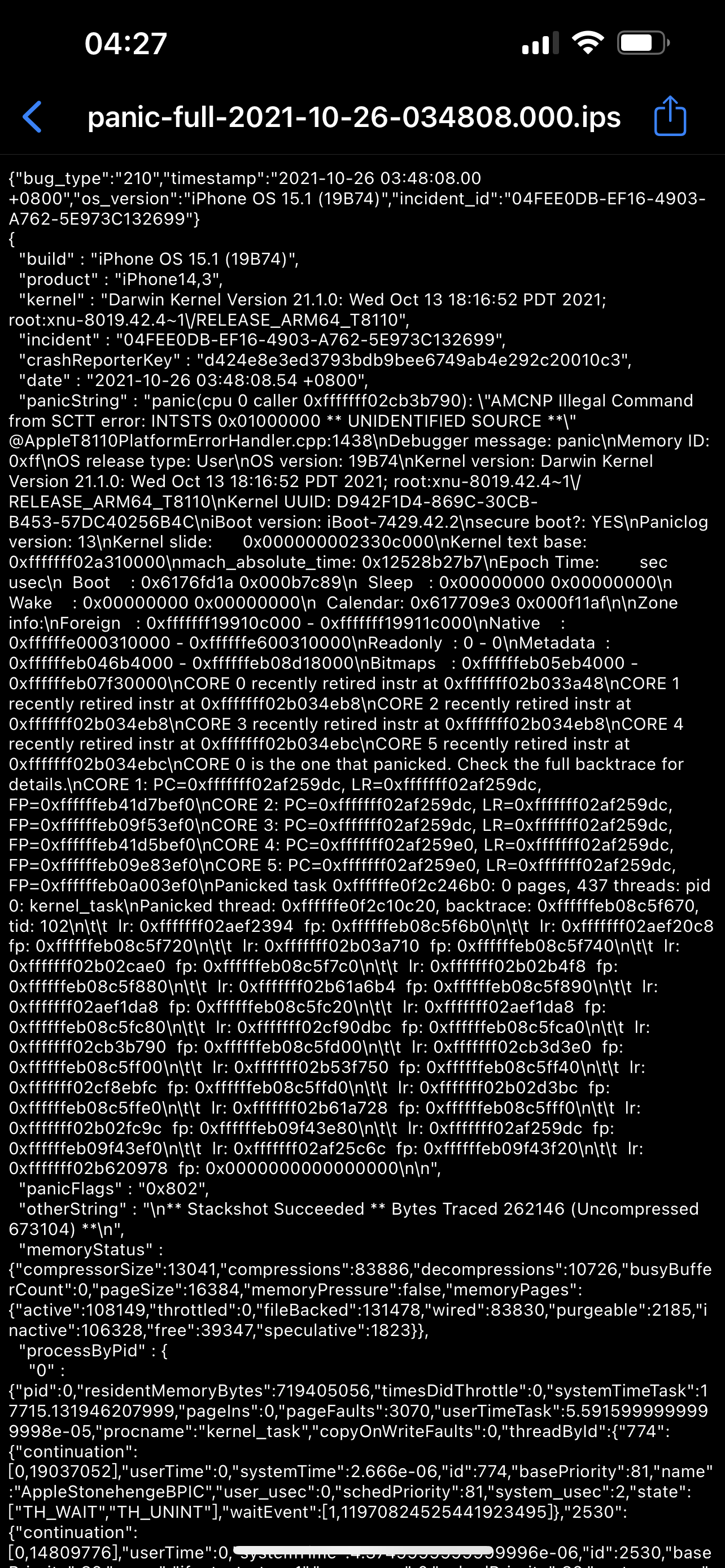 手机激活两天了,使用一直没有问题,直到更新ios15.1版本,想看一下微距功能,打开相机,准备试试微距,卡了一秒,然后紫屏重启了。之前使用微距拍照没有问题,也没出现任何重启问题,看了错误报告,也没有人帮忙看看是什么情况?系统问题还是硬件问题,要怎么解决,大佬们,帮忙看看.