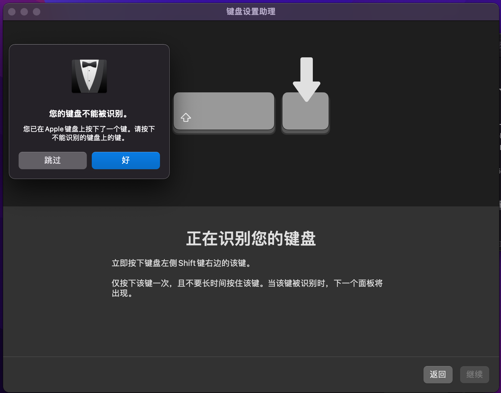 Monterey后,重启弹窗“键盘设置助理”,提示无法识别键盘类型。