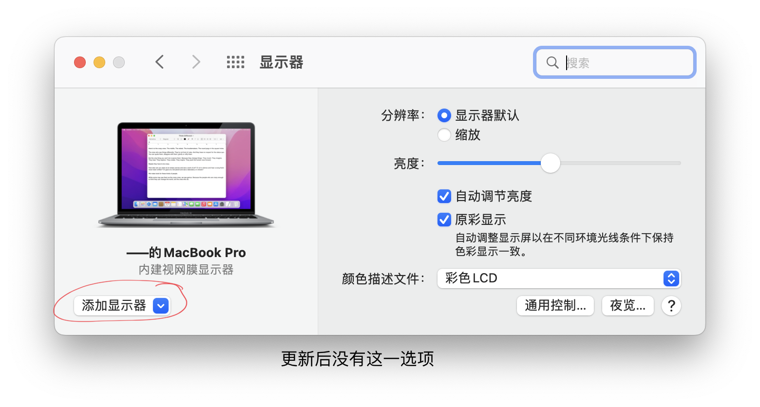 把mac系统更新到macos monterey随航不见了,控制中心随航图标也没有了。显示器设置添加显示器没有ipad选项