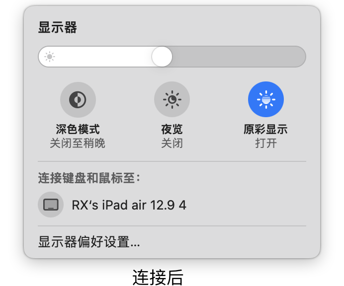 另外,如果mac上重新登入id后还是无法扩展屏幕,mac需要重新启动,然后在屏幕镜像里就会出现ipad。屏幕亮度的下拉菜单已经没有了。