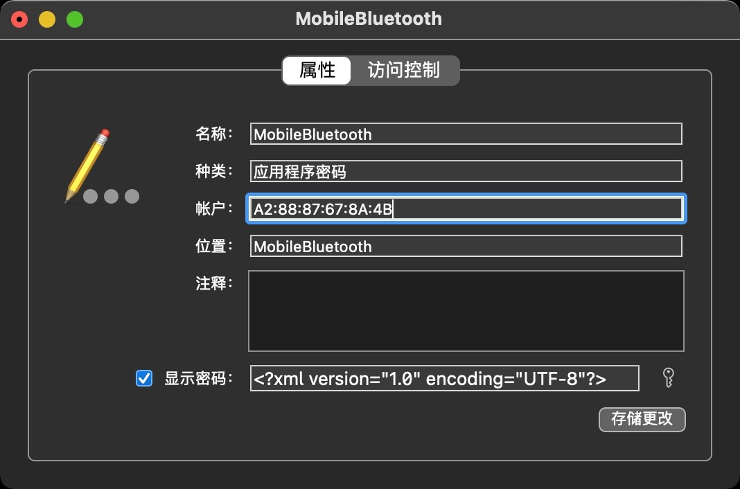 在“显示密码”中,里面保存的其实是一个 文本的 plist 文件,其中保留着电脑自己的蓝牙 Mac 地址,以及与外部设备连接的密钥串。见下图所示(大家放心,其中的 MAC 地址已经被改写了,不是真实的数值):