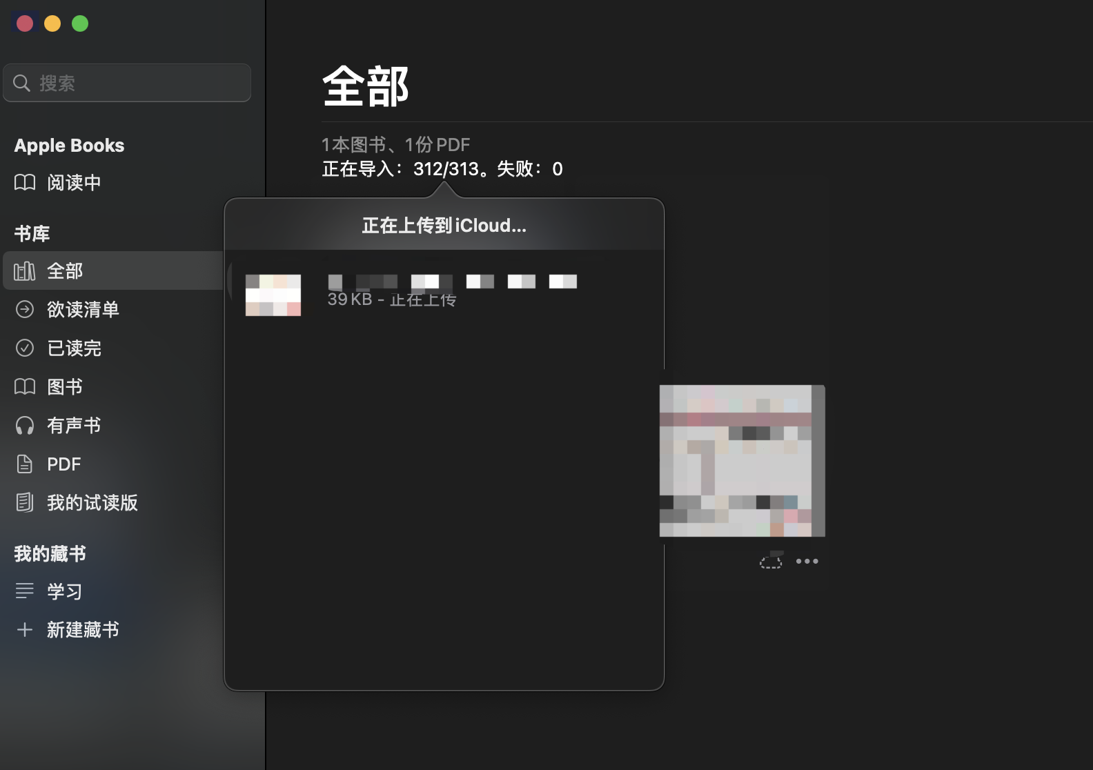 mac的图书软件无法打开pdf,无论是一页的发票还是几百页的电子书。打开图书软件后,点击书库中的pdf文件,书库列表页会展示“正在导入xx/xx。失败:0”字样,xx数字会一直增长,且图书软件始终保持在最前,无法切换别的软件或屏幕。