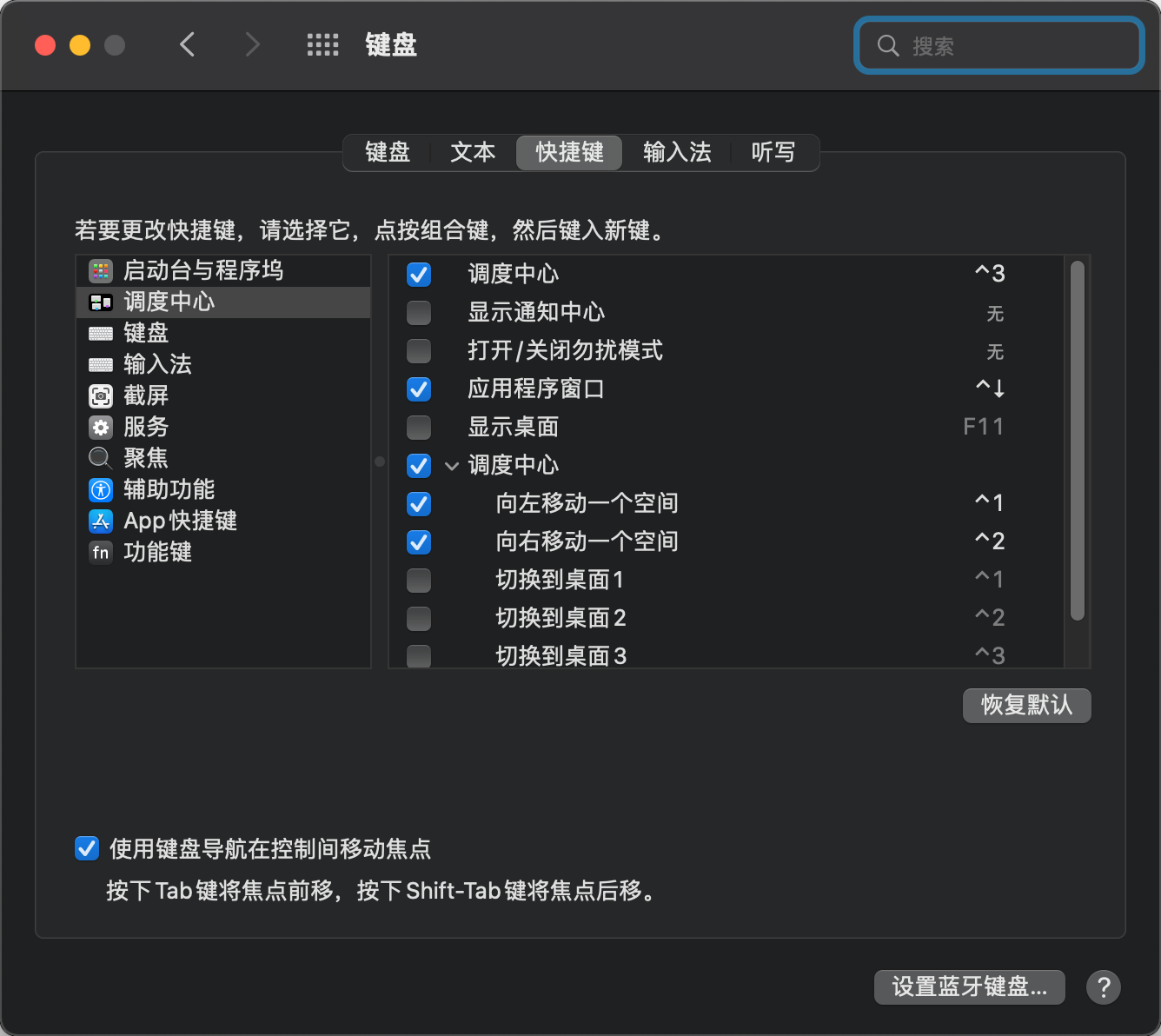在键盘-快捷键-调度中心中,所有的快捷键均可用,但是“向右移动一个空间”总是失效,已经检查过不是快捷键冲突的问题(改成其他的快捷键同样不行,但是用同一快捷键做其他操作可以成功),而“向左移动一个空间”一直有效