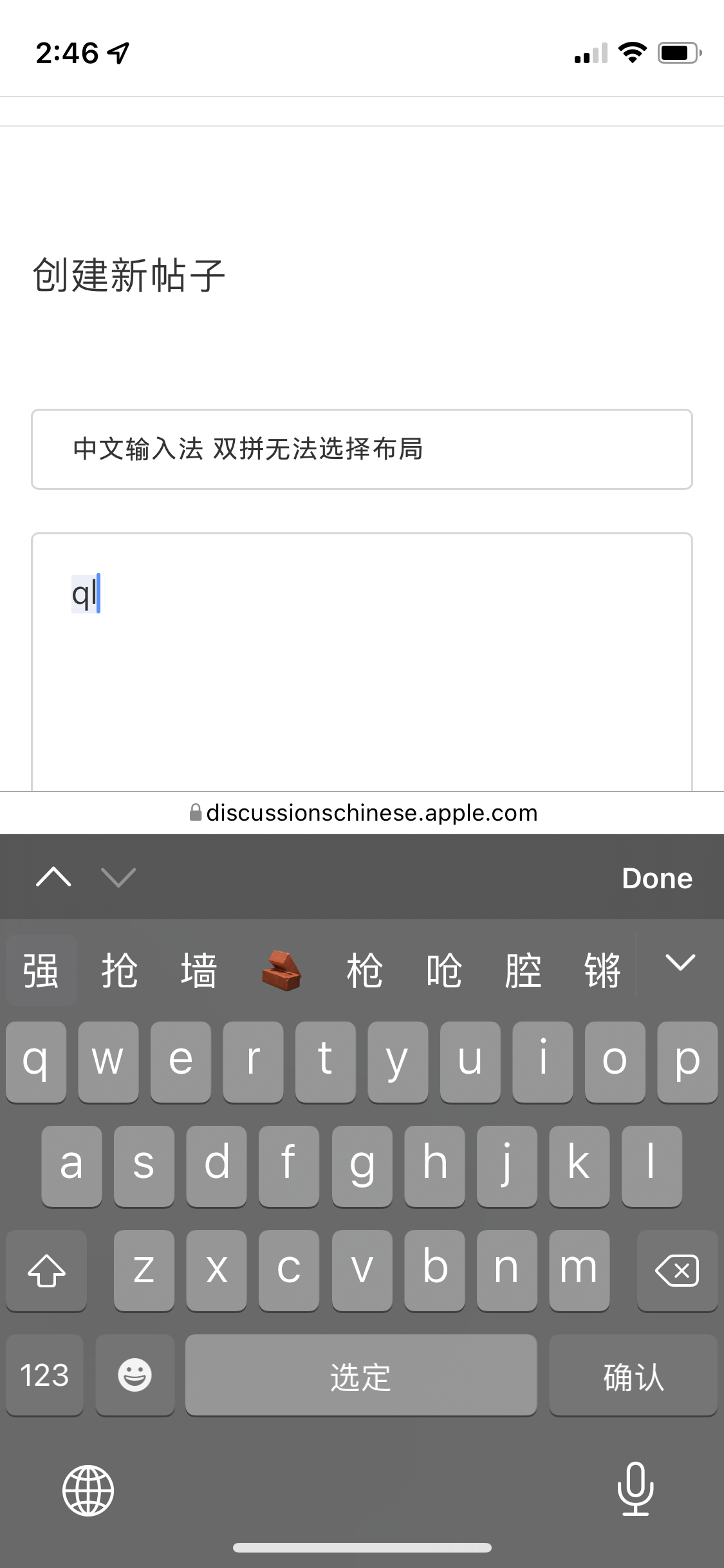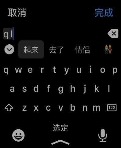 我目前在iPhone上使用了双拼输入法,选择了小鹤双拼布局。在使用Apple Watch的时候,Apple Watch也使用了双拼输入,但是却使用了错误的布局(我猜测是搜狗布局)输入方式完全不同(如图所示)。我好像没有找到修改布局的设置。而且我试图通过添加多个输入法使得在Apple Watch上可以选择另一种中文输入法,比如拼音,但watch上只提供了排序第一的输入法,也就没法选择使用拼音。