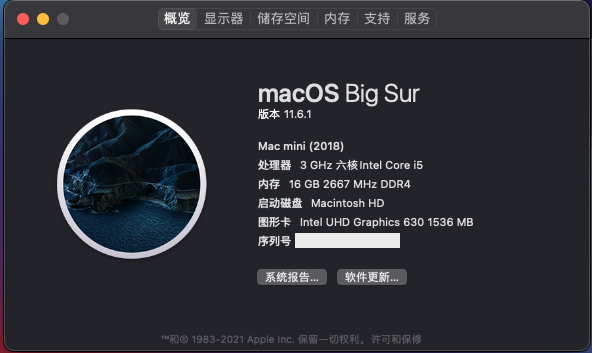 2、设备当前系统版本是:macOS Big Sur 11.6.1