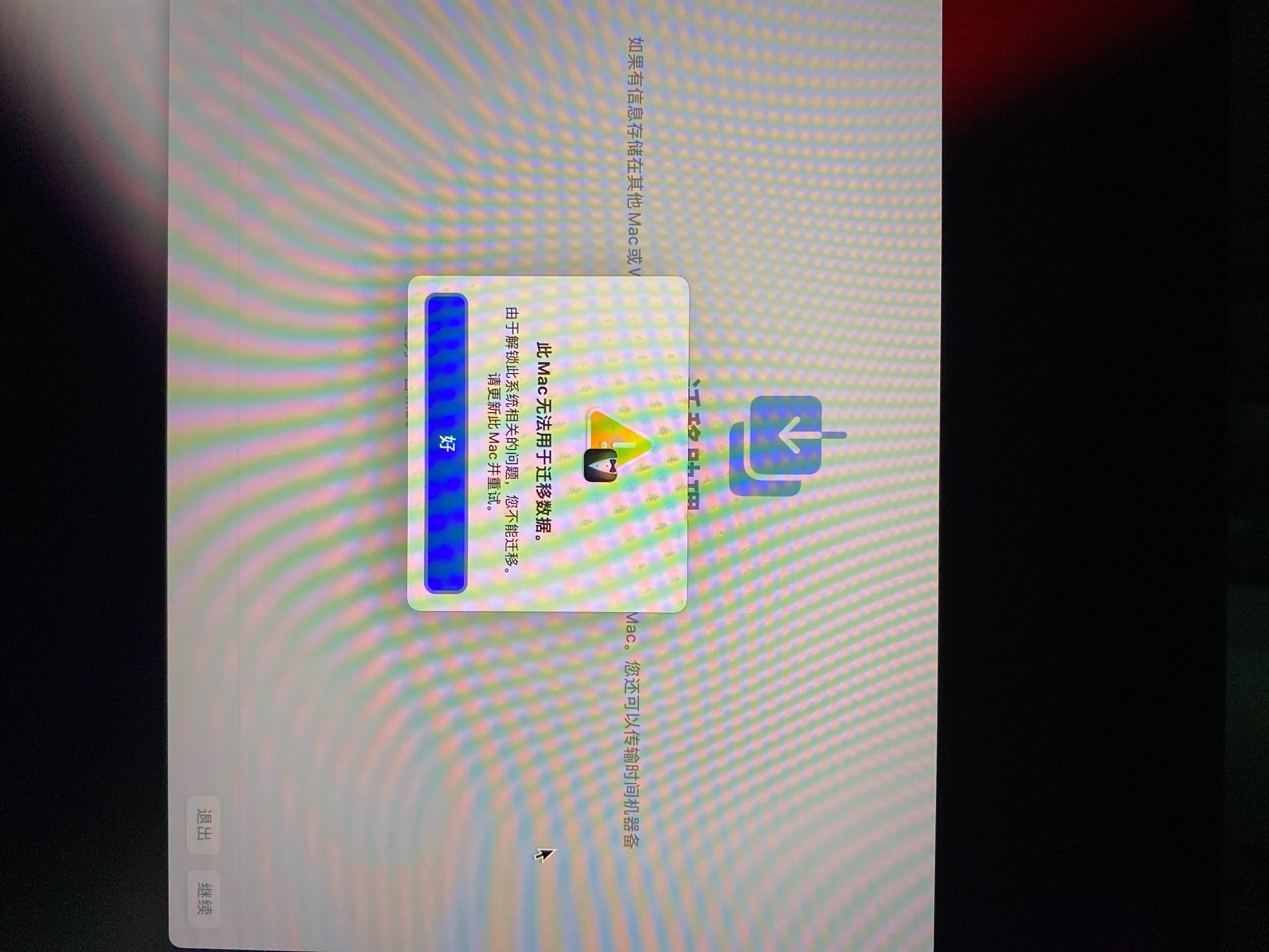c想从老air上数据传到到pro时,pro上显示说此mac无法用于数据迁移,如图,请问是怎么回事啊?