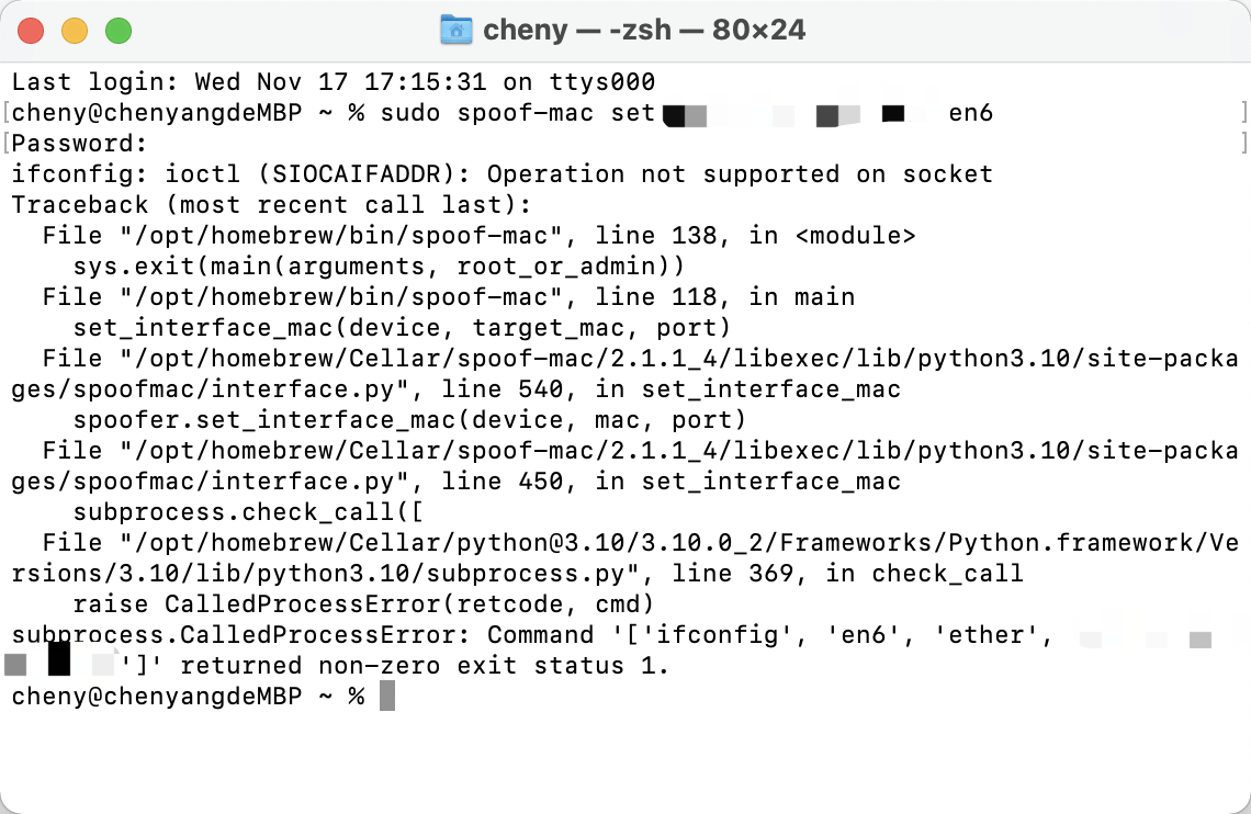 设置 en0 的 Wi-Fi Mac 地址:sudo spoof-mac set aa:bb:cc:dd:ee:ff en0