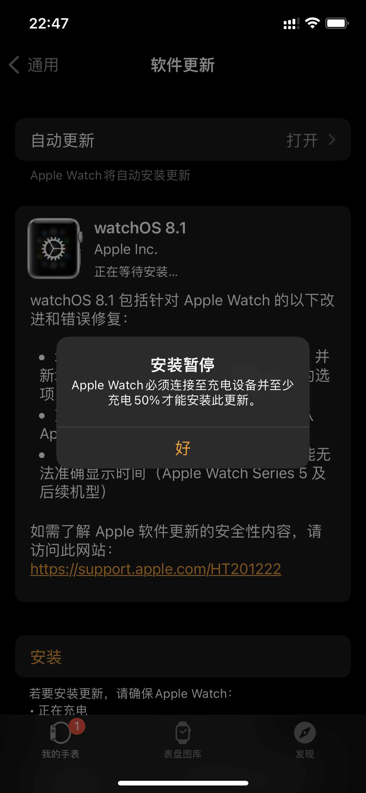 提示可以升级watchos8.1,但选择升级时总是提示Apple Watch必须连接至充电设备并至少