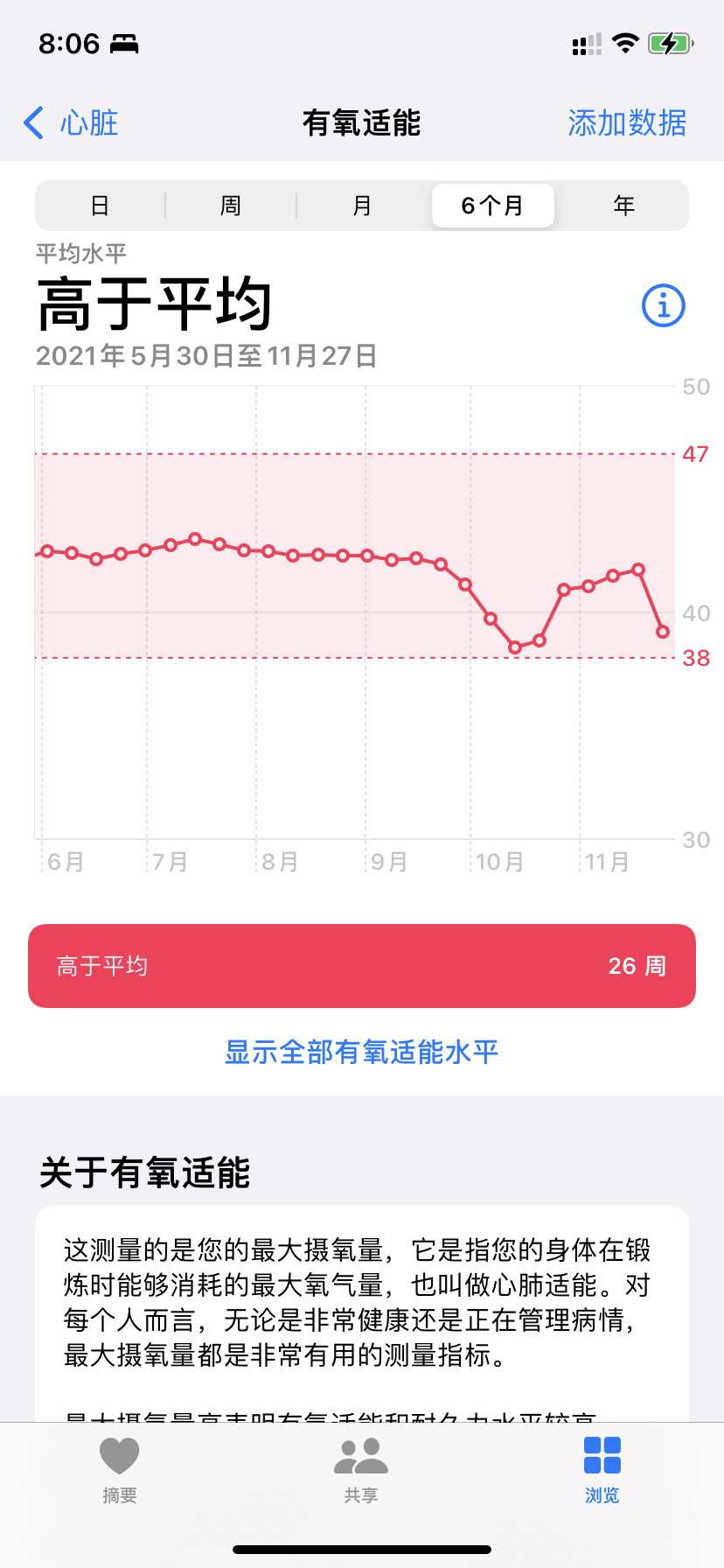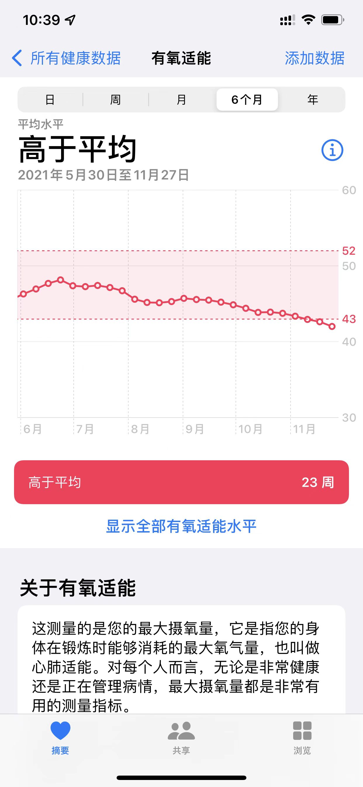 如果是这样,我觉得在算法或者在手机上关于有氧适能的表述就有问题了,在【健康】中写道【最大摄氧量表明有氧适能和耐久力水平较高】,像我每日测出的数据表明【有氧适能在不断降低】,但是就我来看,我的心肺越来越强壮,足以在更低的心跳水平下支撑相同的配速,这是向好的表现。