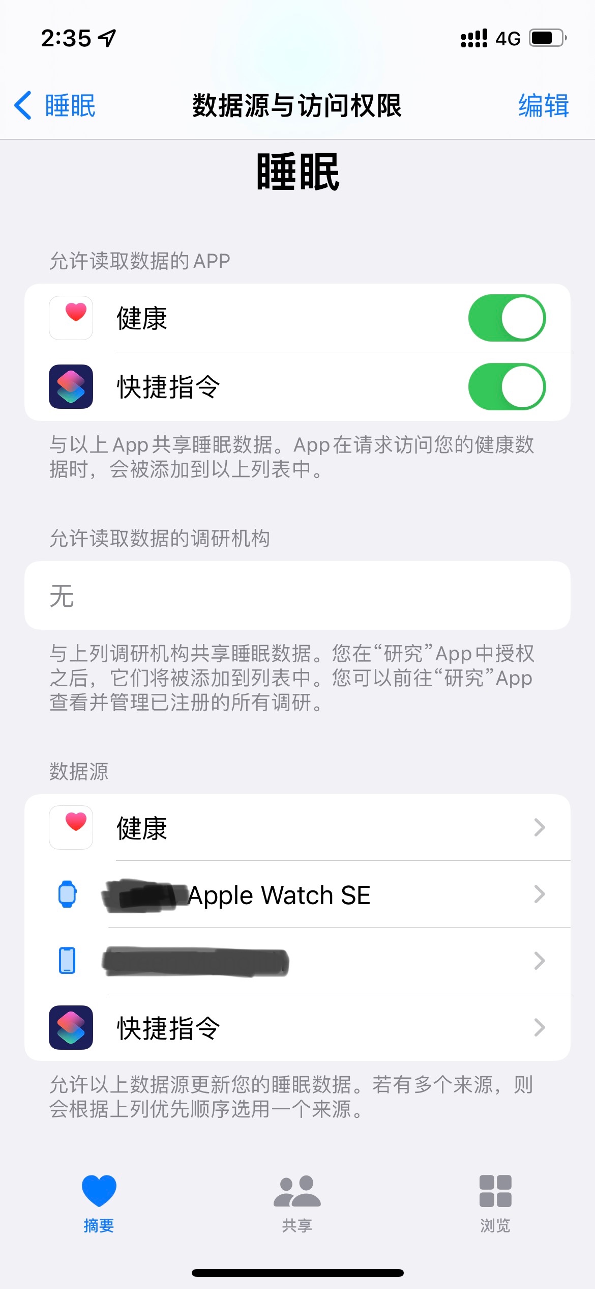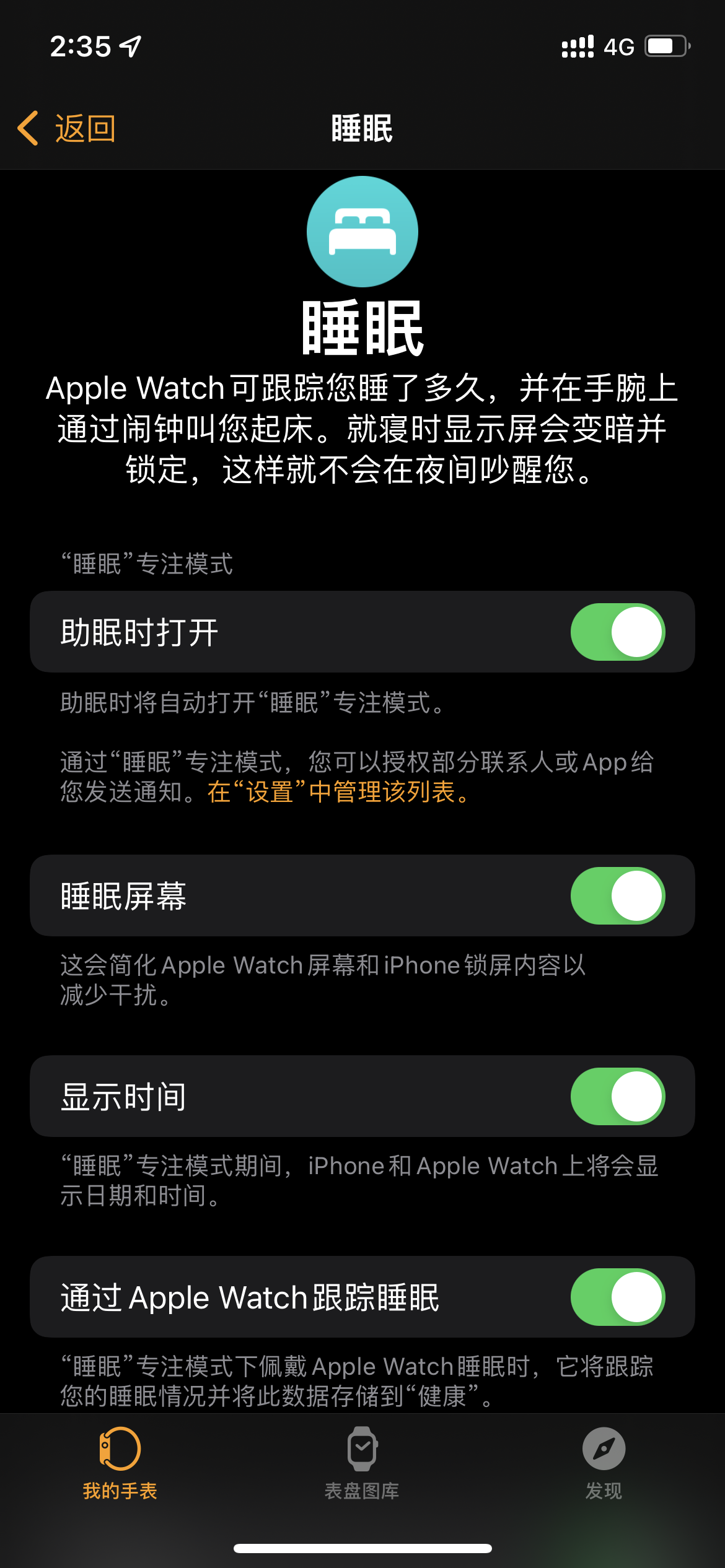 要让Apple Watch 统计睡眠情况的话。在Watch App里打开“通过Apple Watch 跟踪睡眠”,并且要在 健康App 的 睡眠-数据源与访问权限里添加Apple Watch。如下。
