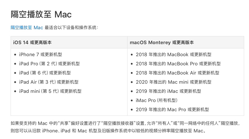 5.适用于 MacBook Pro (2018 年及后续机型)、MacBook Air (2018 年及后续机型)、iMac (2019 年及后续机型)、iMac Pro (2017 年机型)、Mac mini (2020 年及后续机型)、Mac Pro (2019 年机型)、iPhone 7 及后续机型, iPad Pro (第二代及后续机型)、iPad Air (第三代及后续机型)、iPad (第六代及后续机型) 和 iPad mini (第五代及后续机型)。 当“共享”偏好设置中的“允许以下用户隔空播放”设定为“任何人”或“同一网络中的任何人”时,较早的 iPhone、iPad 和 Mac 机型向所支持 Mac 机型分享内容的分辨率可能较低。