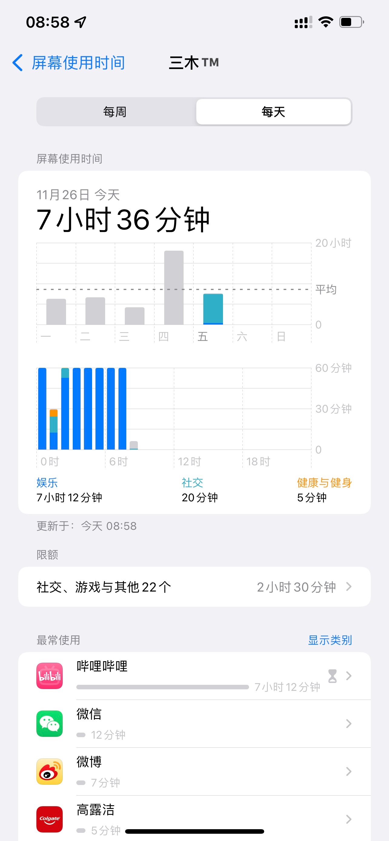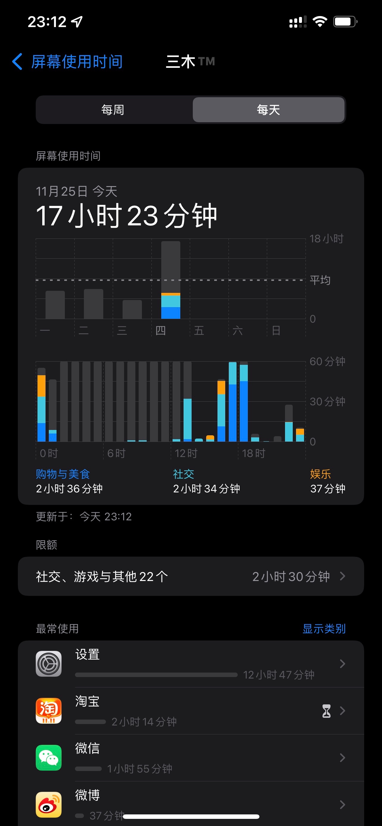 为了控制社交时间设置了限额并每天监控,这两天的screentime记录明显有问题。首先是11月25号在我睡觉期间(手机屏幕保持锁定)显示“系统”使用了屏幕,且当天我并没有打开淘宝但淘宝竟然有两个小时使用时间。。。一开始可能是什么bug,决定再看看,然后就是昨晚也出现了相同的情况,但更离谱。