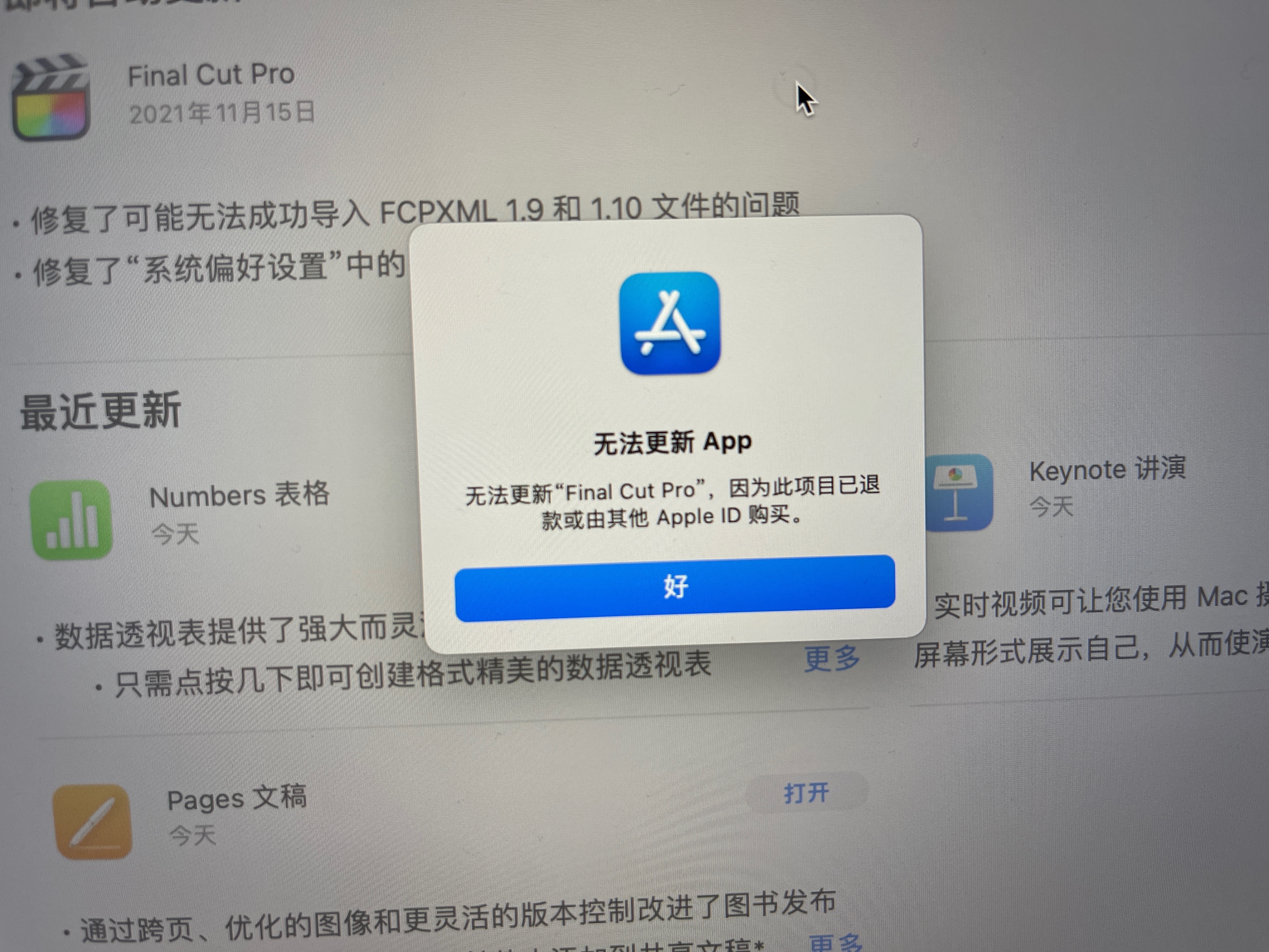 apple商店买机器时一并购买了finalcutpro,新机预装了的,现在无法更新,appstore提示已退款或由其他ID购买