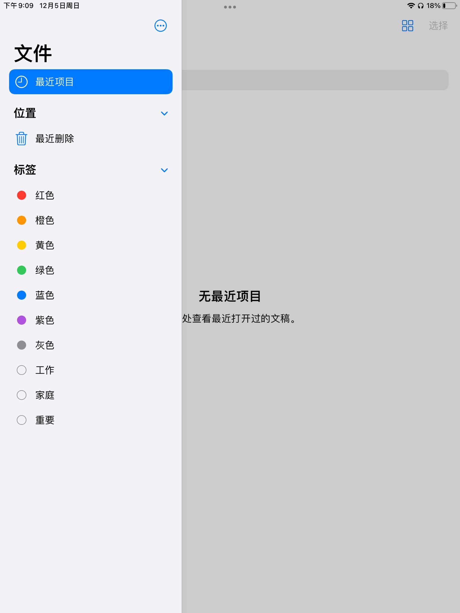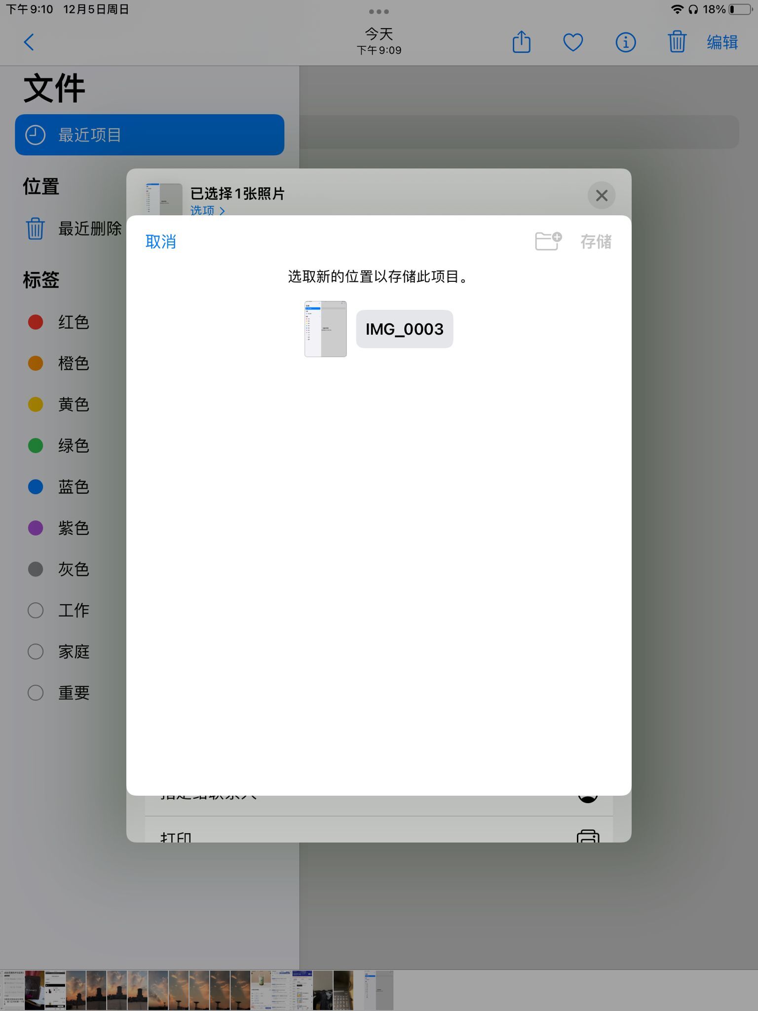 文件中位置只有“最近删除”这一项,没有“我的ipad”,也没有“icloud”,尝试把照片存储到文件,存储按键是灰色的
