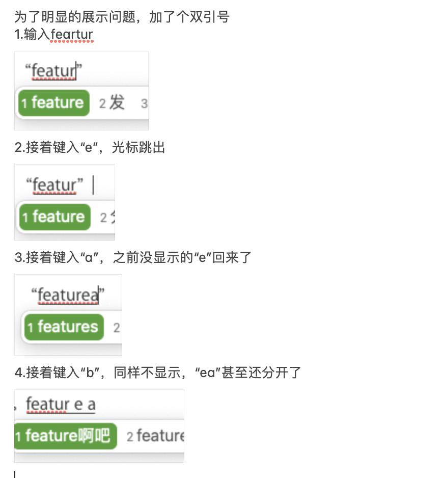 最近遇到一个苹果自带拼音输入法的问题。比如我在这个输入法下打impression这个单词,一直输入到“impressio”都是正常的等我一敲“n”这个键后,单词就会变成“impressi”没掉“on”,后续再输别的字母会显示出的确输入上了。