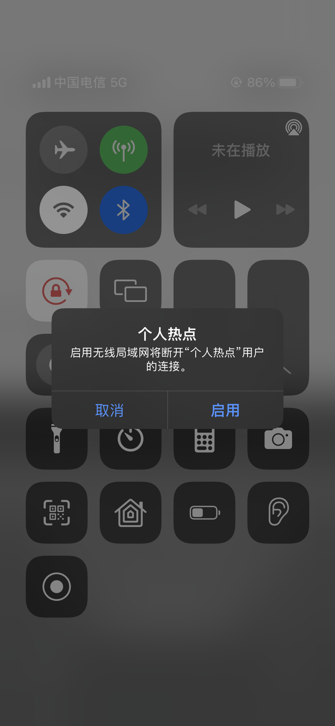 ,且在iPhone端从控制中心打开无线局域网被告知启用无线局域网会断开个人热点连接,但点击启用后没有任何响应。