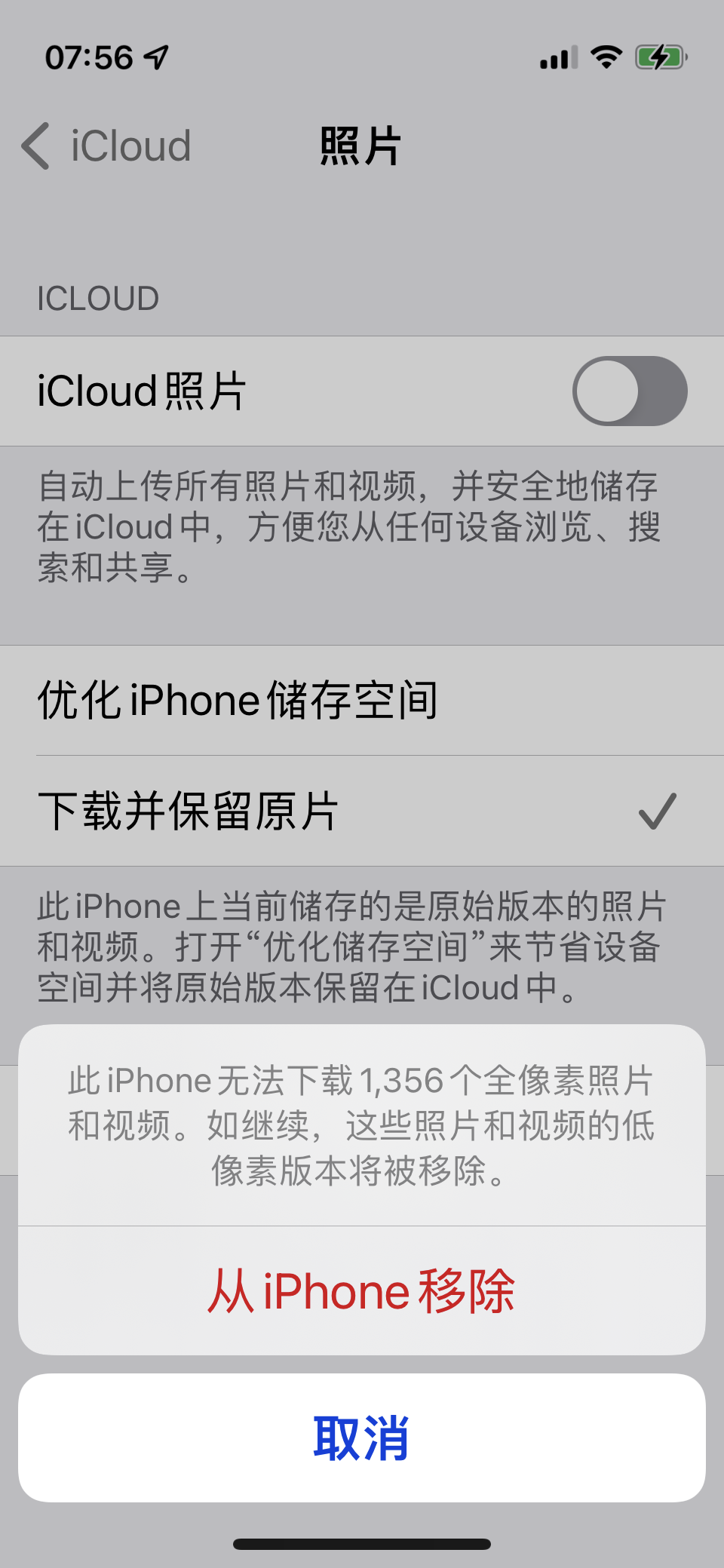 想关掉iCloud照片但是iOS15.1系统提示无法下载1k多个全像素照片和视频,怎么办?已接入无线网和电源一周,也重启过。