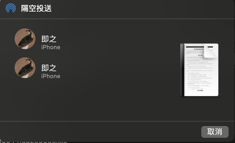 3、在设备“叁”即MacBook上进行隔空投送,另外两部设备(手机)在其上显示的名字一模一样毫无区别。如图二。