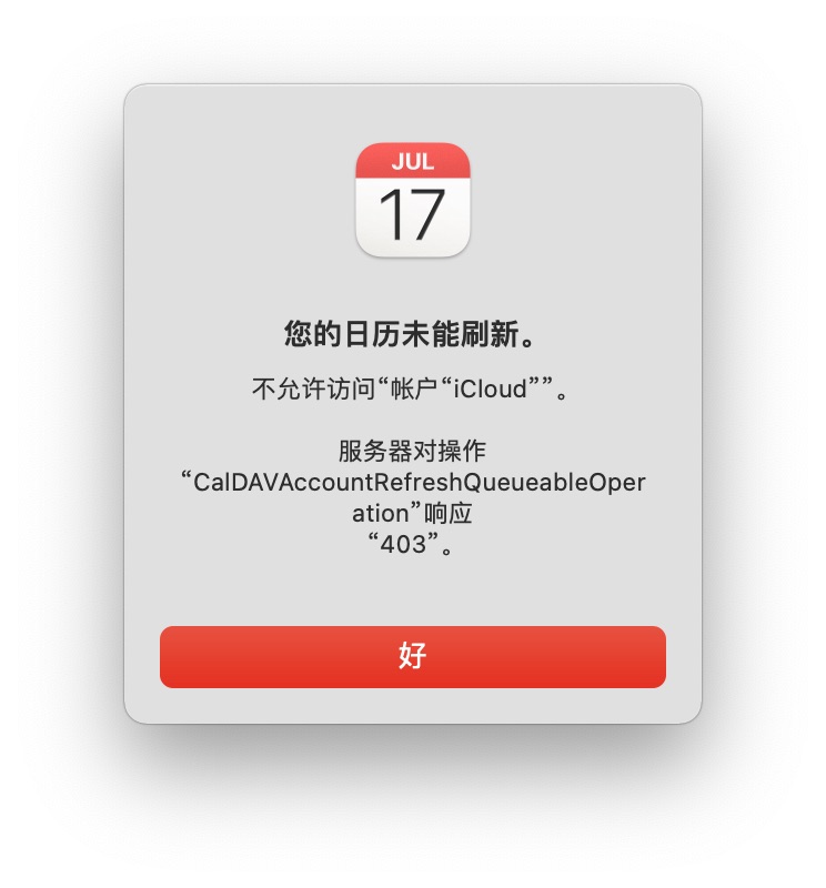 - 您的日历未能刷新。 不允许访问“账户“iCloud””。 服务器对操作“CalDAVAccountRefreshQueueableOperation”响应“403”。