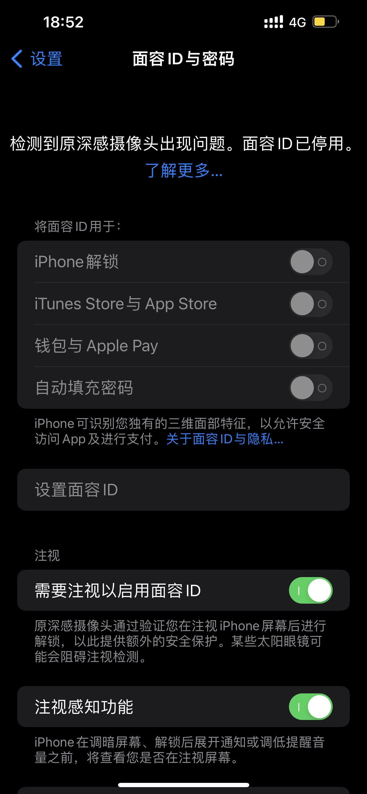 购买一个多月的13PM,突然出现面容 ID停用提示,且无法重新录入,关机后又开机(算是重启),又可以正常录入并使用。出现问题第二天到天才吧检测,显示硬件无问题。出现问题时,已在环境温度零上,但应该不超过5度的室外待了近1小时,现无法确认是否为环境所致,有类似情况的朋友吗