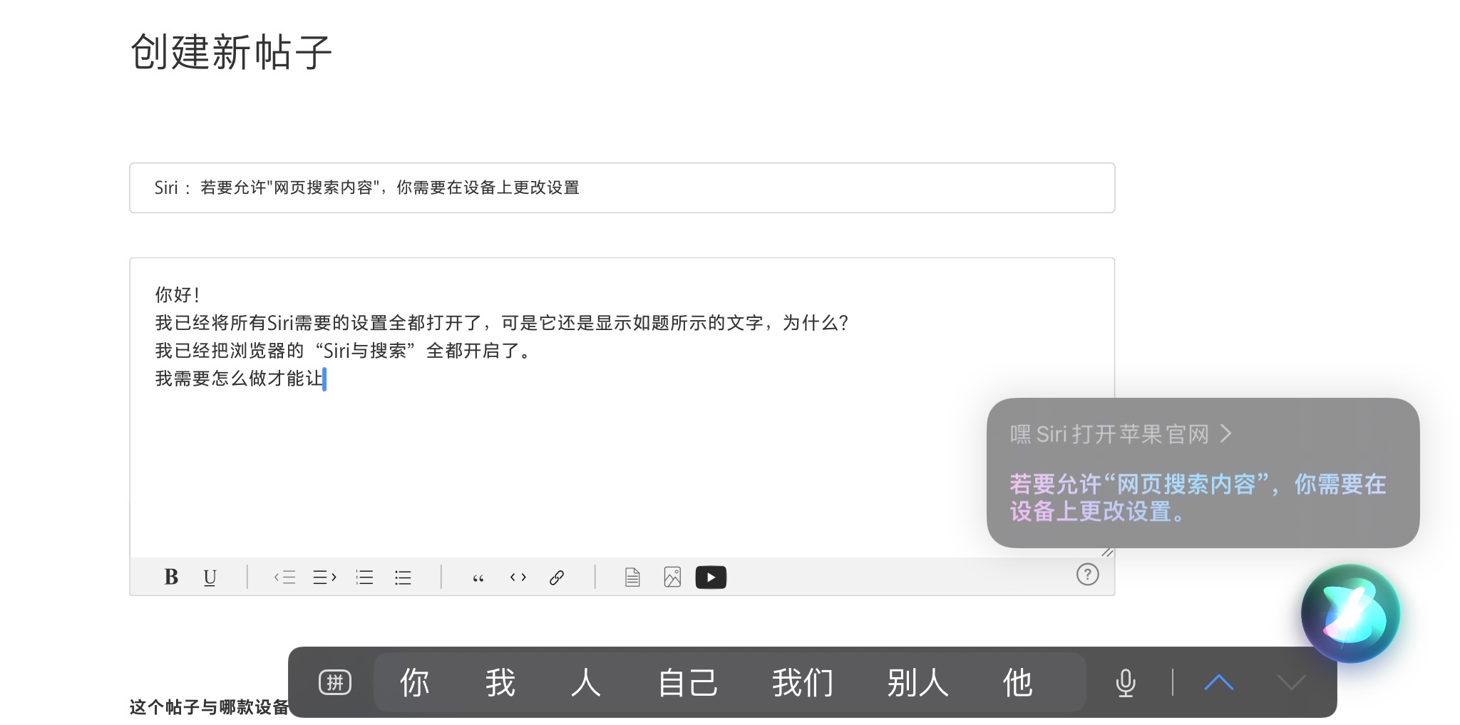 我已经将所有Siri需要的设置全都打开了,可是它还是显示如题所示的文字,为什么?并把浏览器的“Siri搜索”全都开启了。