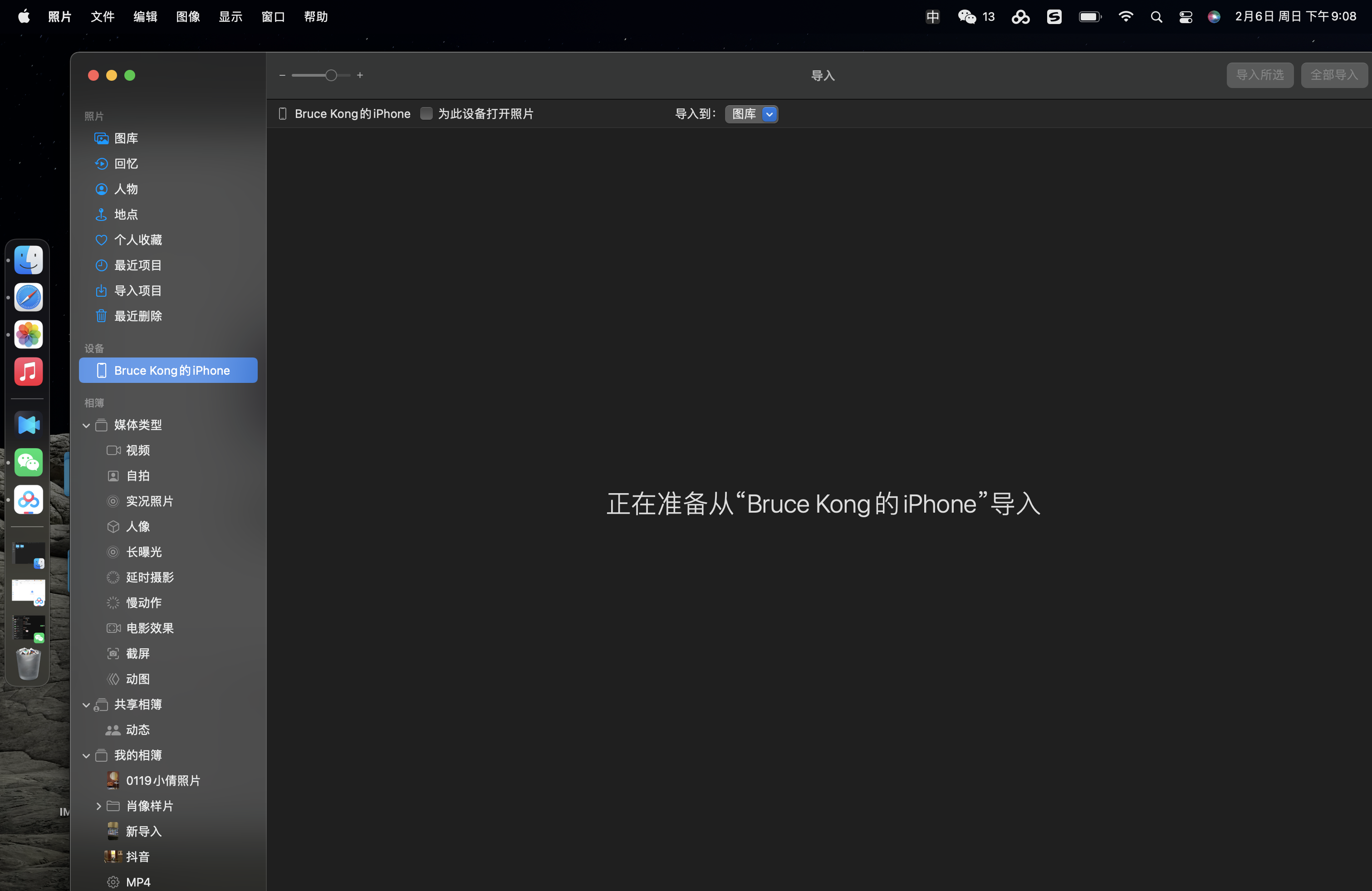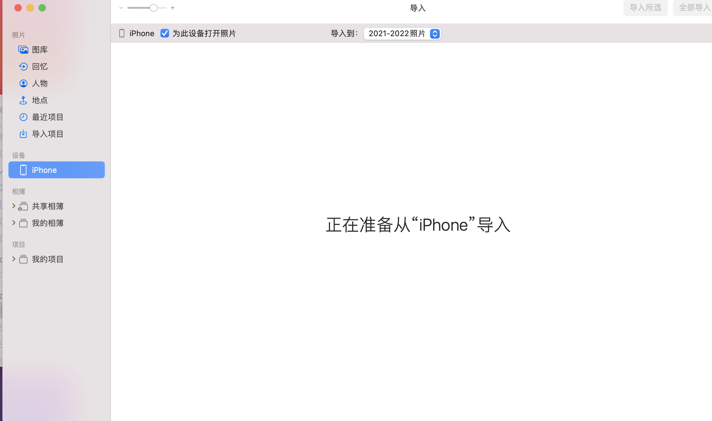 希望从iPhone导入照片到Mac的照片应用。Mac连接iPhone后,照片中对应设备页一直停留在:正在准备从iphone导入照片的页面。