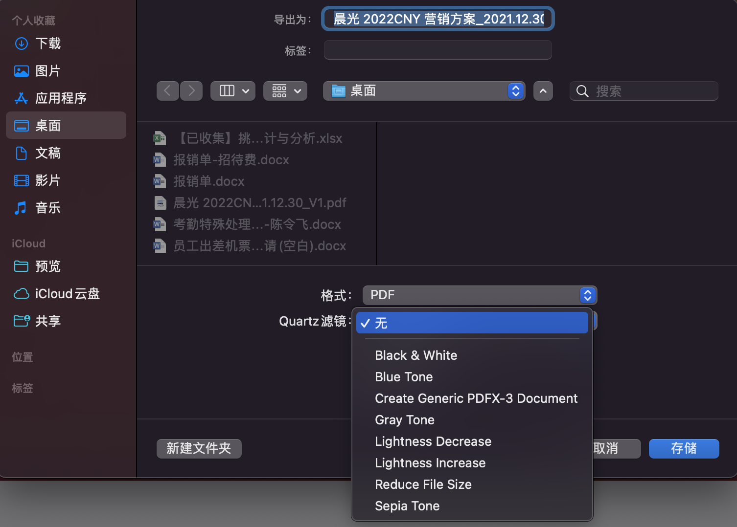 PDF 导出界面 Quartz 滤镜选项变成英文