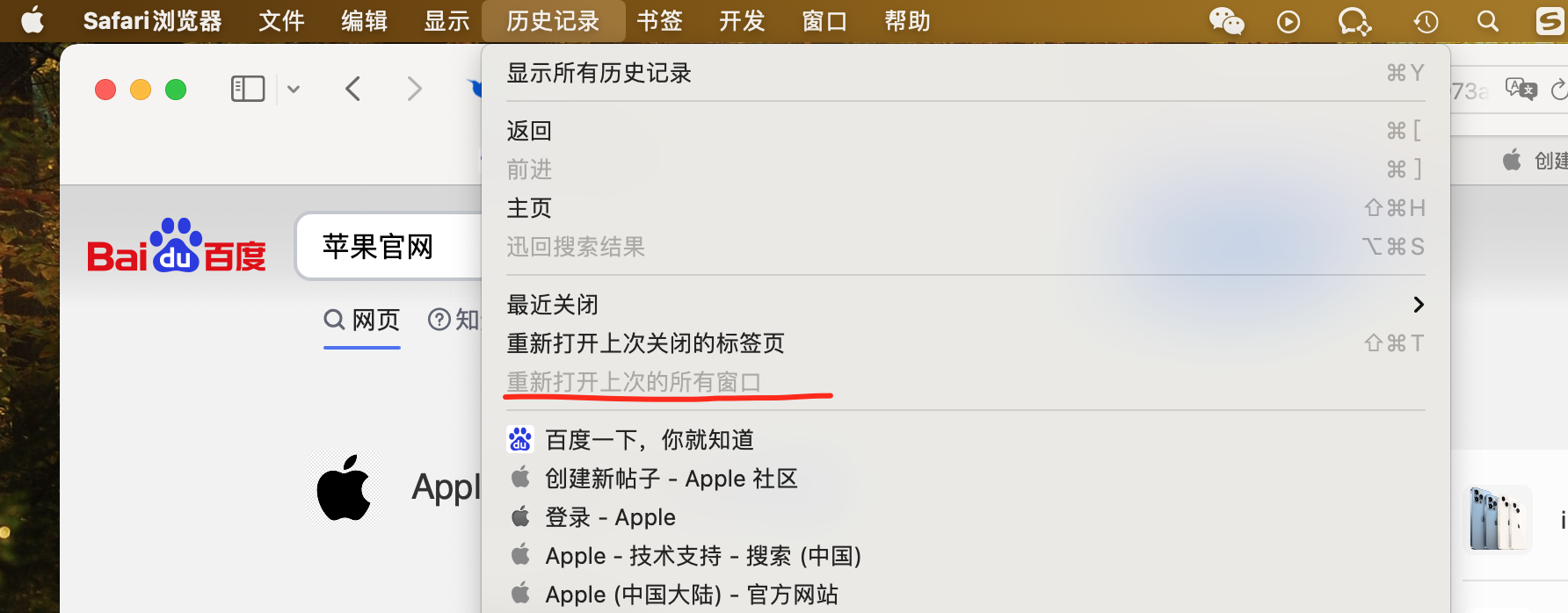 怎么恢复safari浏览器历史记录中“重新打开上次的所有窗口”功能?