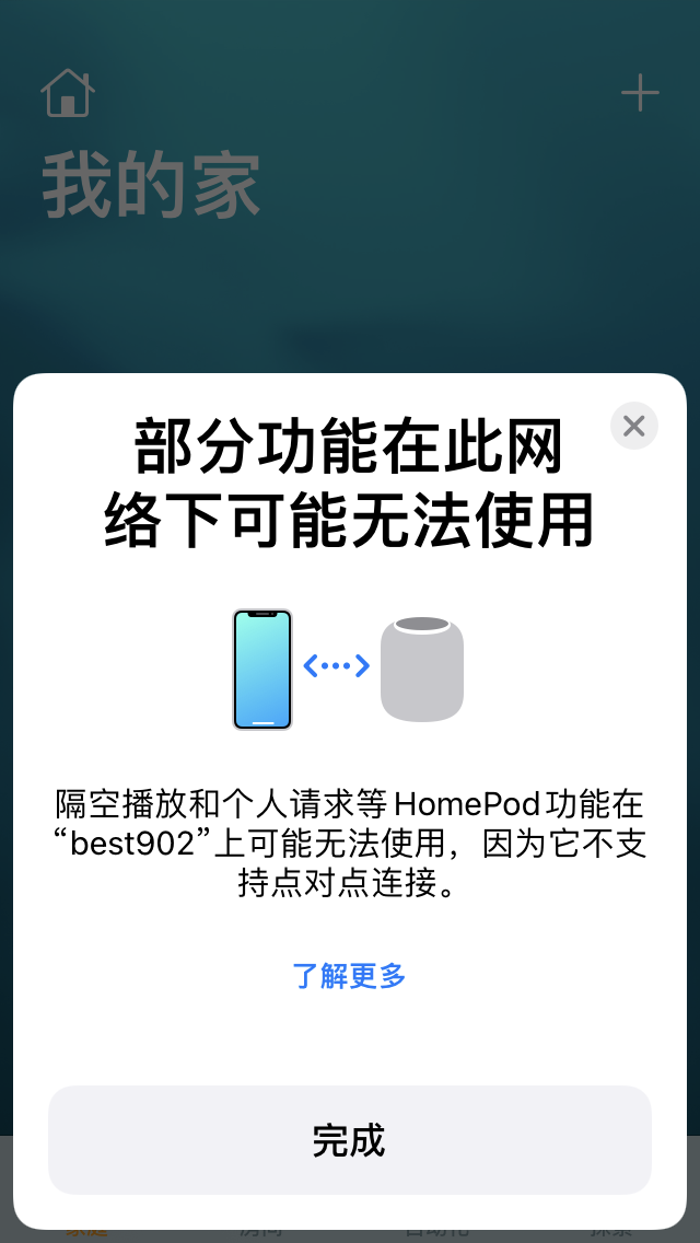 “部分功能在此网络下可能无法使用”——隔空播放和个人请求等Homepod功能在“家庭网络名称”上可能无法使用,因为它不支持点对点连接