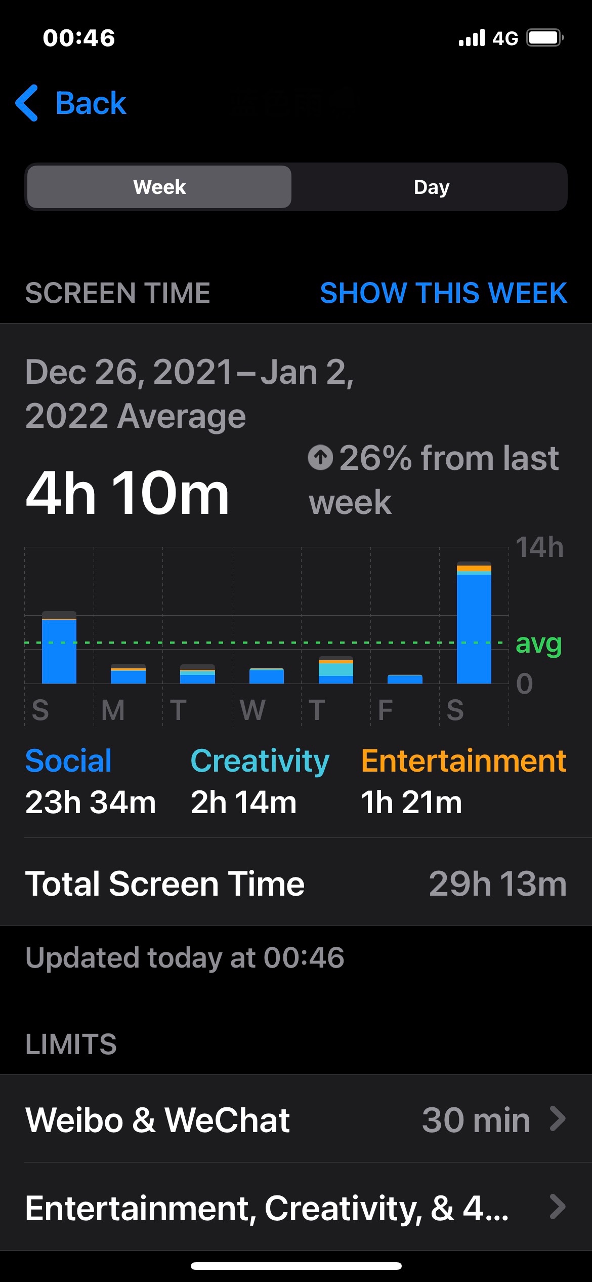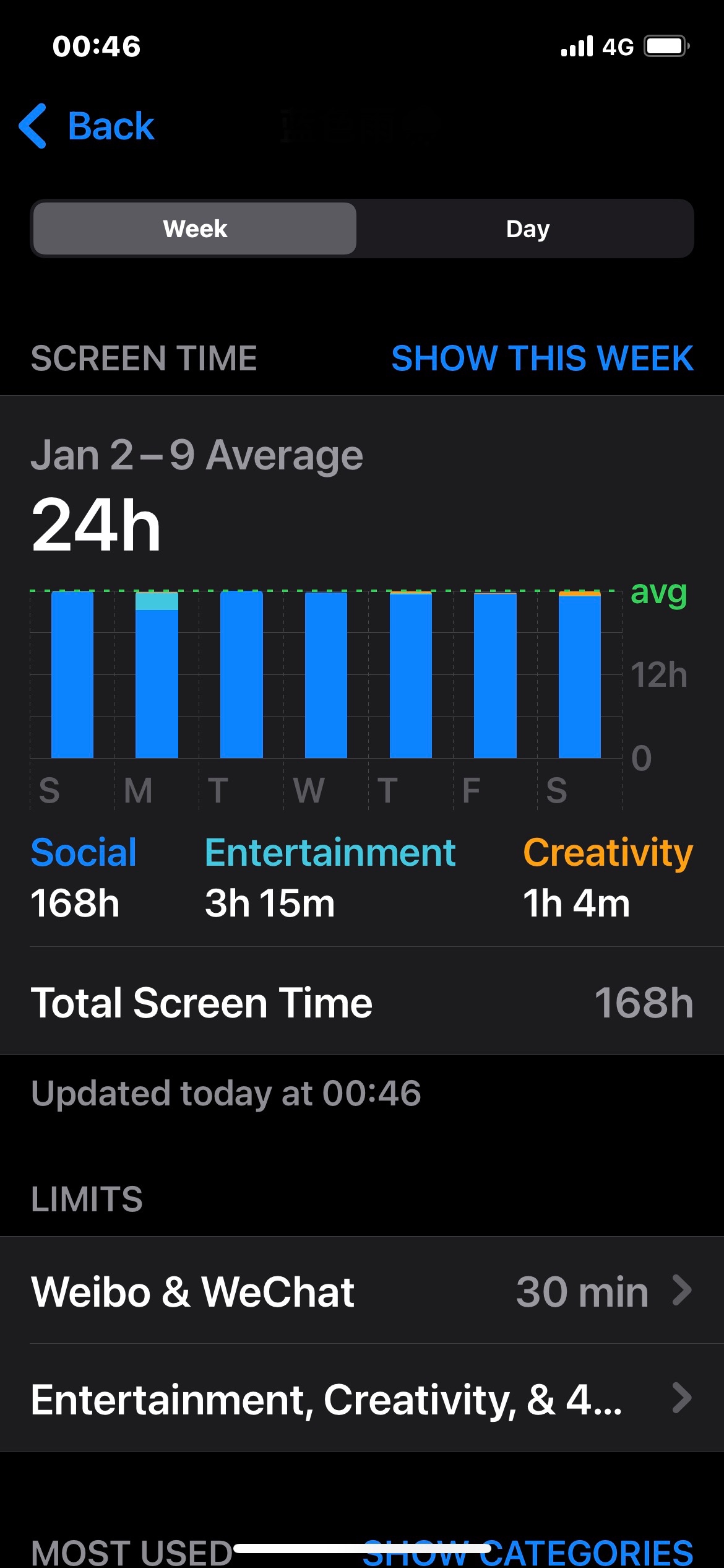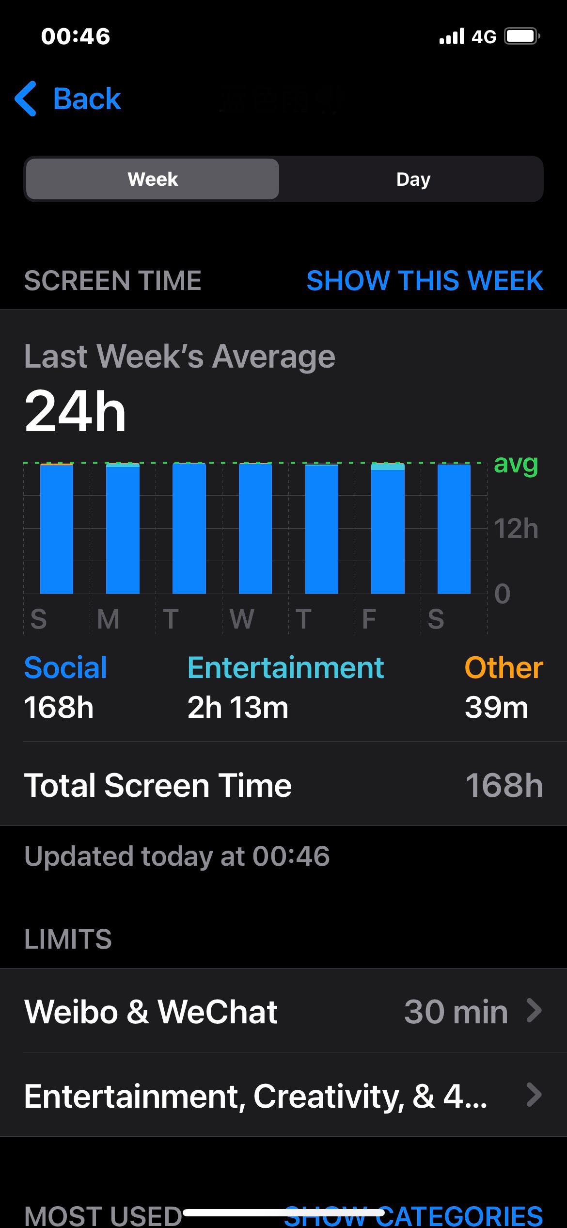 而且这个星期又出现了这个问题,还是微信占用屏幕使用时间24h,但实际上每天两个小时的开屏时间都不到!