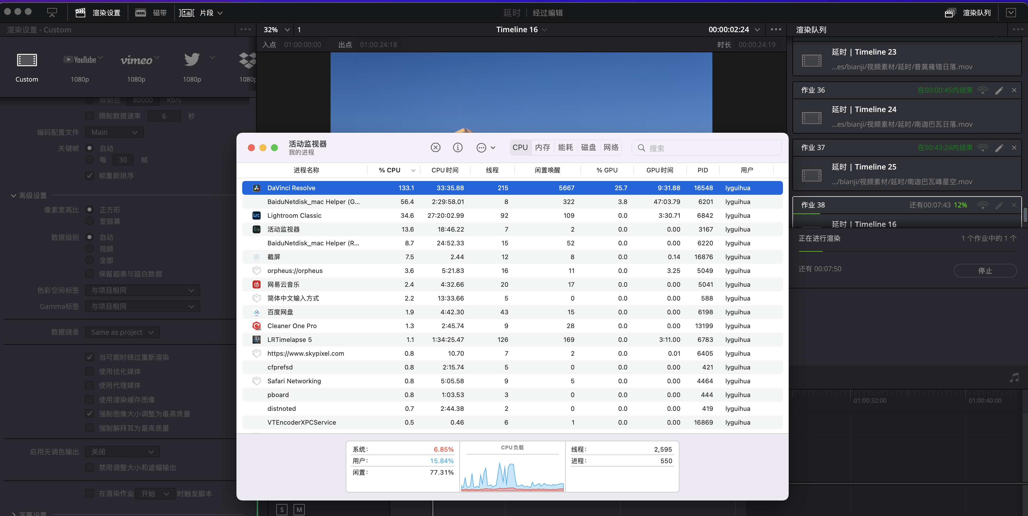 达芬奇cpu和gpu占用率低,导致渲染等速度非常慢