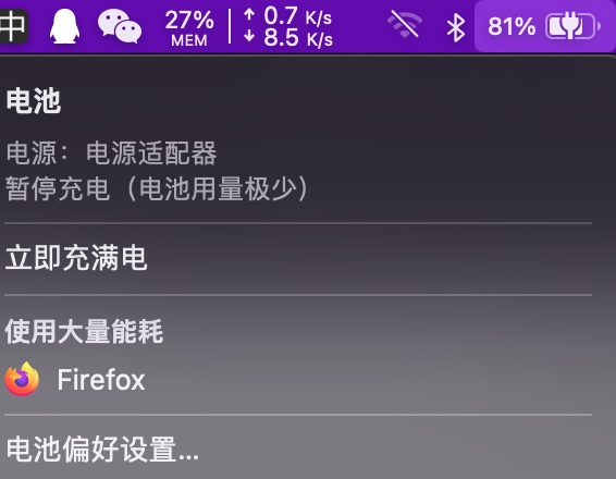 如果您本次需要尽快为 Mac 充满电,请点按电池状态菜单中的“立即充满电”。