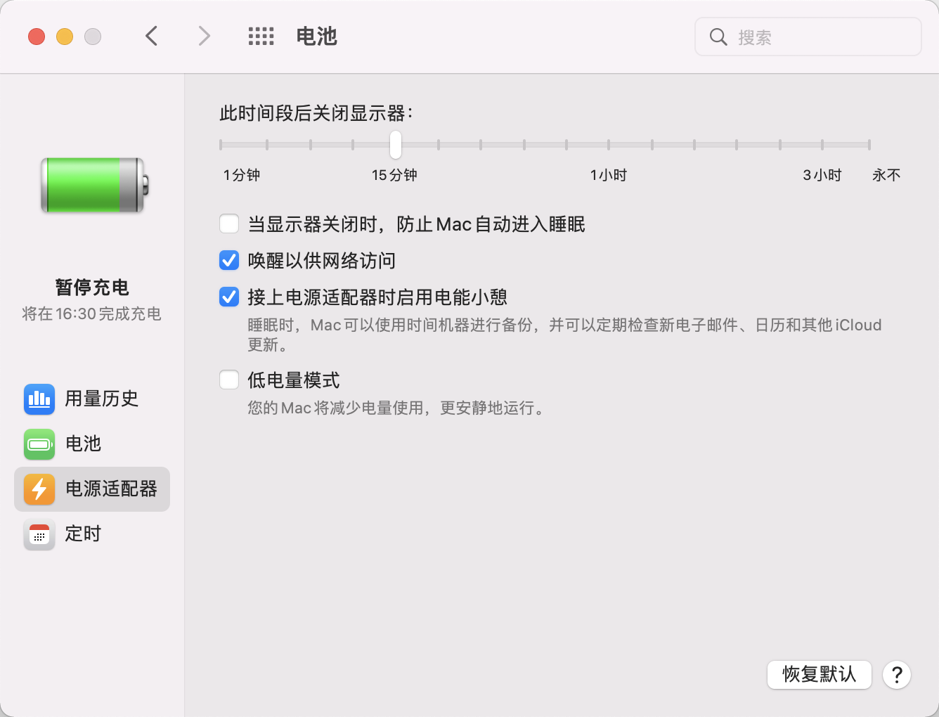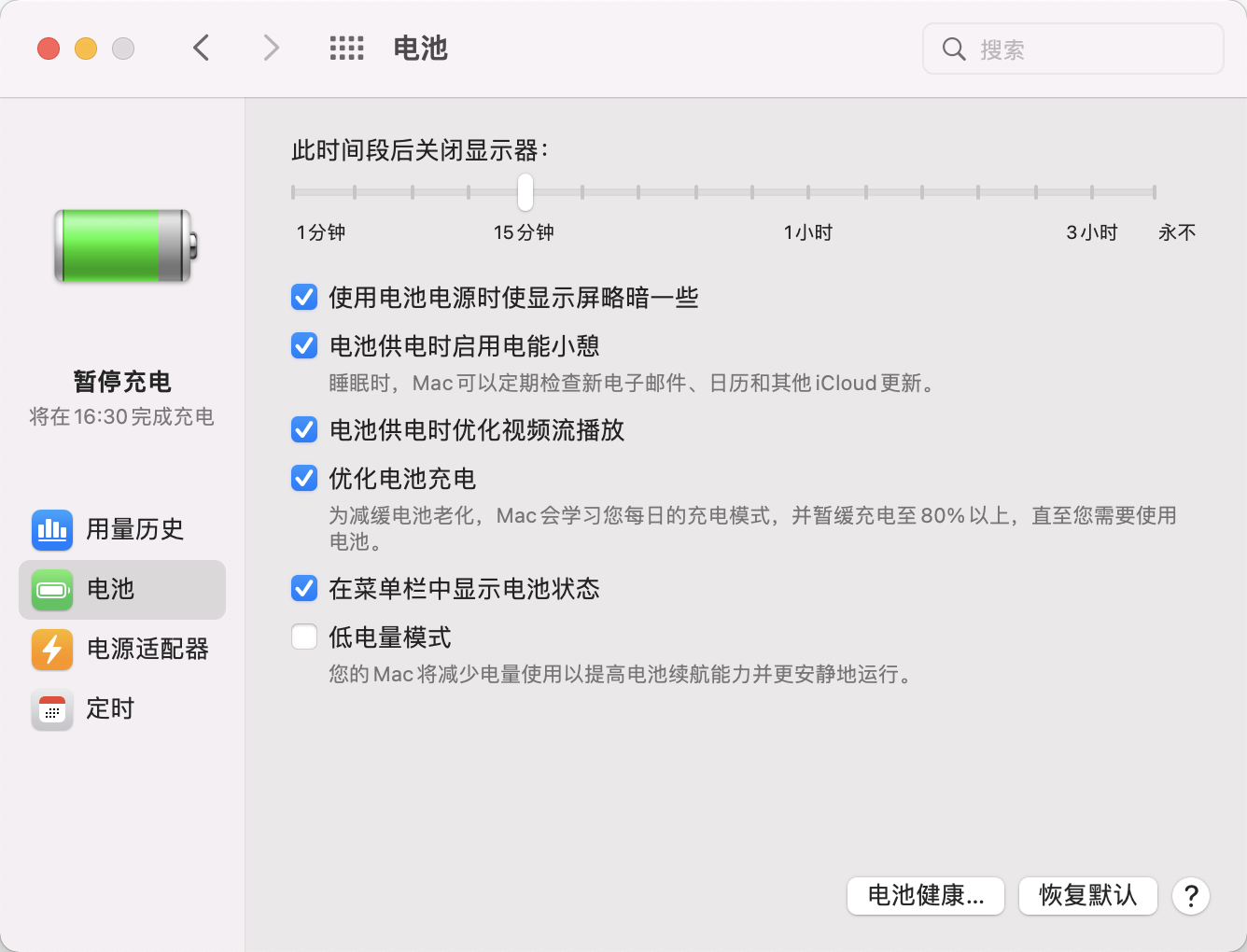 已经在电池中设置了15分钟关闭显示器,可是过了时间也不关闭。这是为什么?