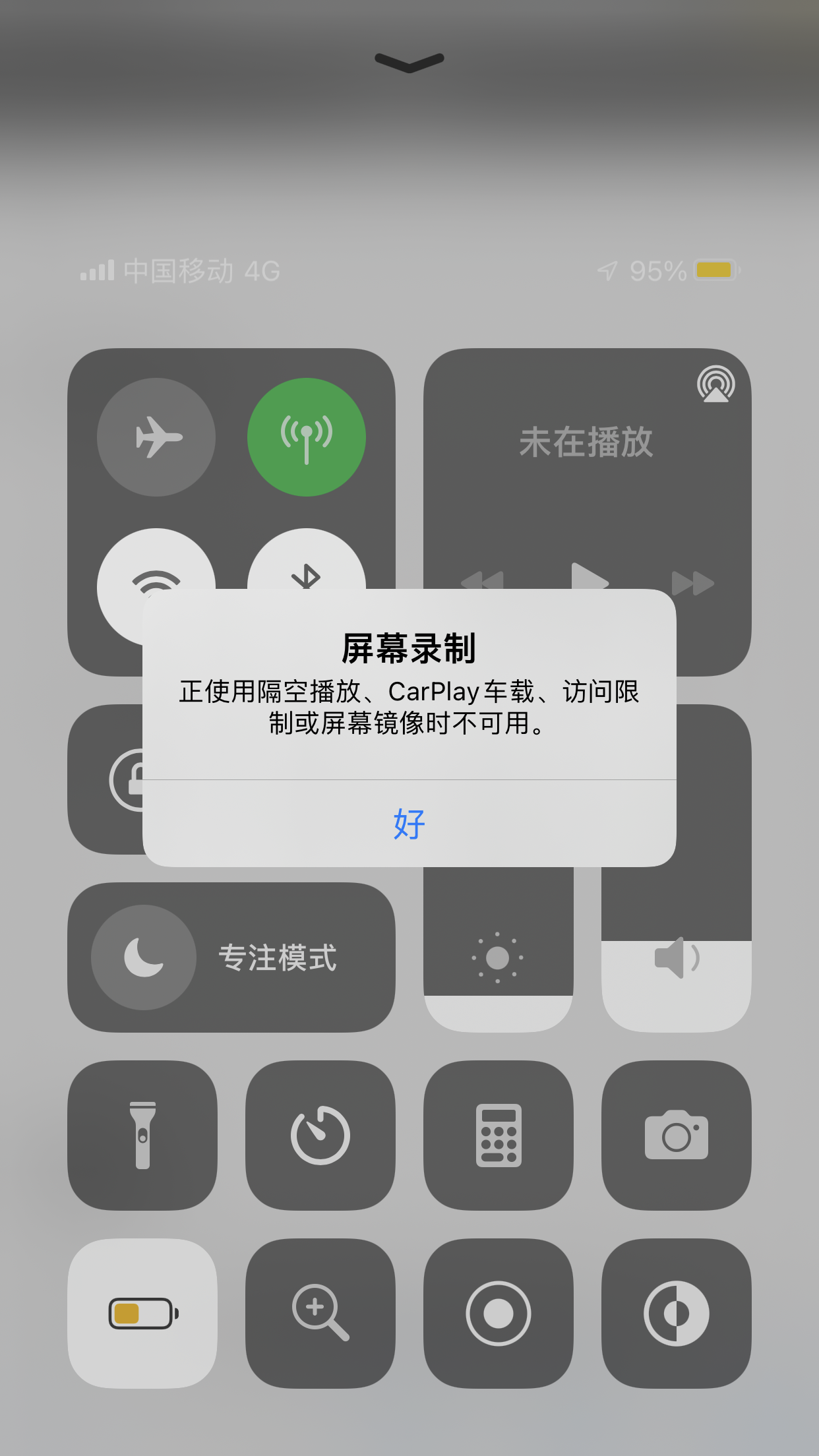 iPhone8Plus,ios15.2.1,录屏功能不可用,老是提示“正在使用隔空播放、CarPlay车载、访问限制或屏幕镜像不可用”