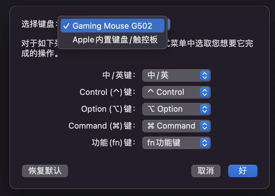 连接外接鼠标 logitech G502 时,会出现【更改键盘类型】,点击【修改修饰键】还会出现鼠标选项,并且能出现【键盘设置助手】