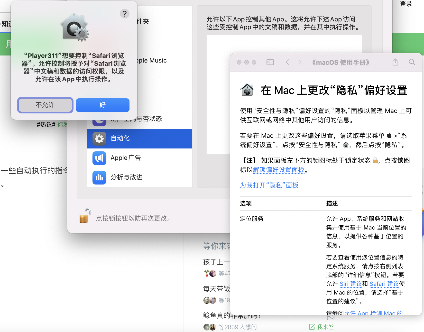 我的电脑出现一个在设置的安全性与隐私模块使用自动化运行的病毒。当取消player311程序控制Safari浏览器当且打开Safari浏览器后就会提示“Player311想要控制Safari浏览器”可以选择不允许或好。当选择不允许时,会继续调出这个问题直到你选择好。如果手速不够快的话,在“Player311想要控制Safari浏览器”弹窗之后,紧接着会跳出一个弹窗,显示你的电脑空间不足的弹窗,且只有取消该操作(即不取消player311控制Safari浏览器)一个选项。
