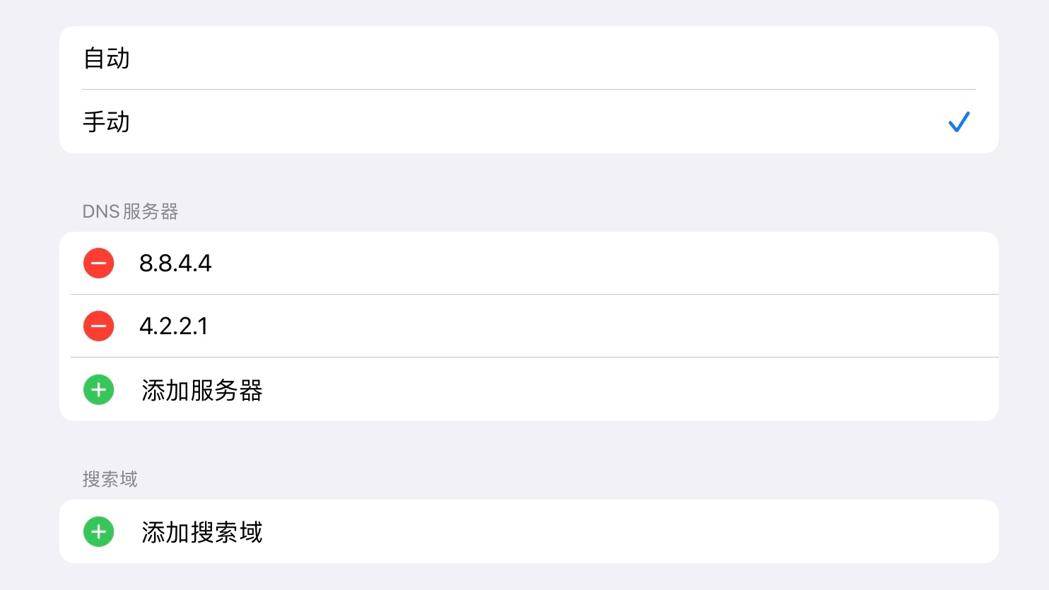 ③将此wif的DNS配置为手动,在下方添加以下两个DNS地址: