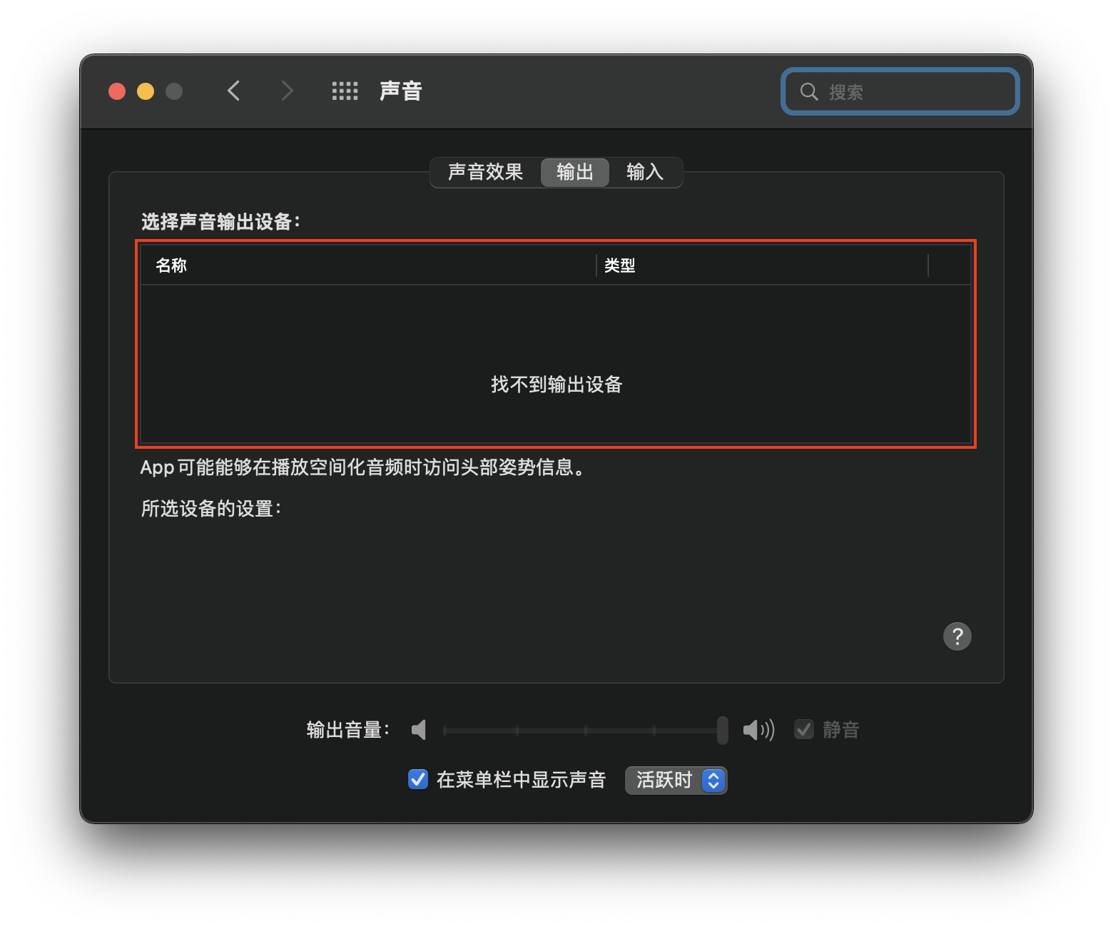 有时在 系统偏好设置>声音>输出 选项卡 中显示 "找不到输出设备"