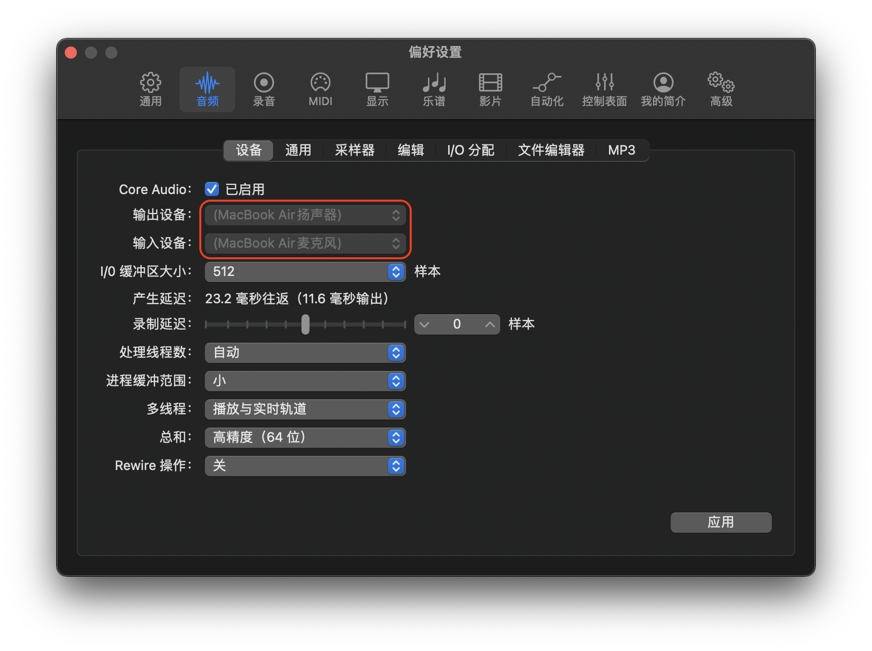 在 "Logic Pro" 中显示 "选定的驱动程序未找到" , 并且在此软件的 偏好设置>音频>设备 选项卡 中 "输出设备" 和 "输入设备"的下拉选择框也处于禁用状态状态