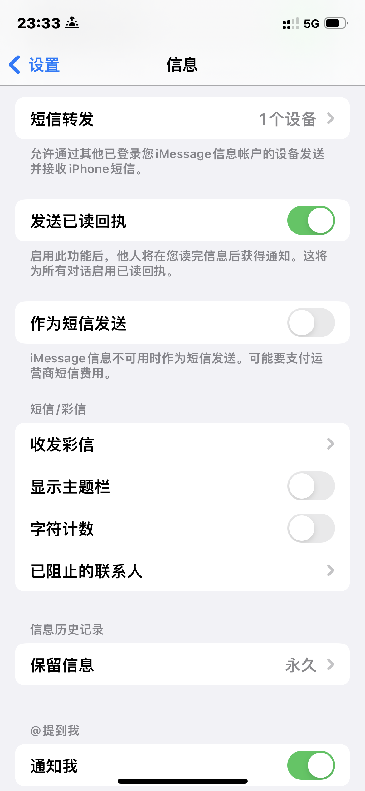 1. 设置-信息-作为短信发送 开启后 ,如果发送iMessage信息给其他设备,当iMessage功能由于某种原因不可使用时,信息将会以短信方式发送给对方(并收取一定运营商费用)。