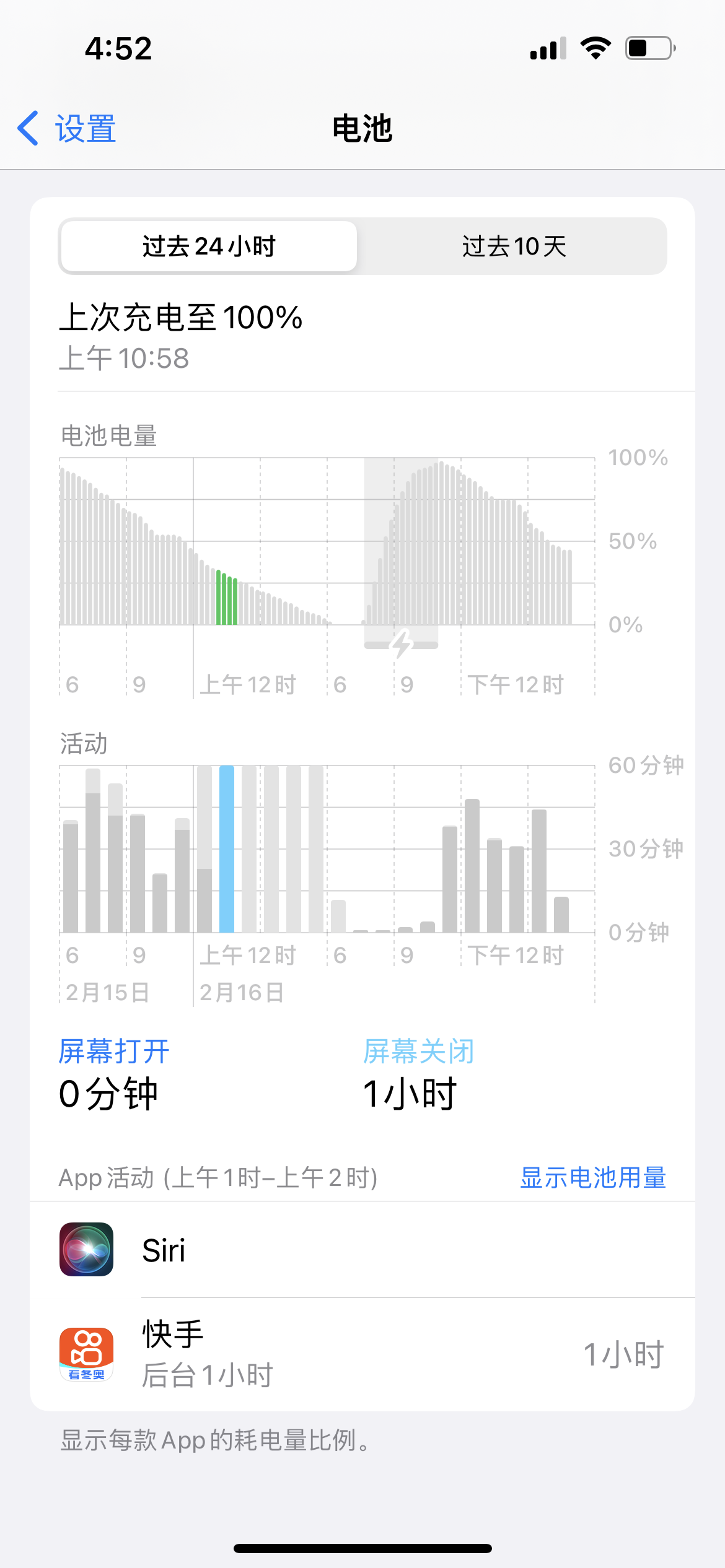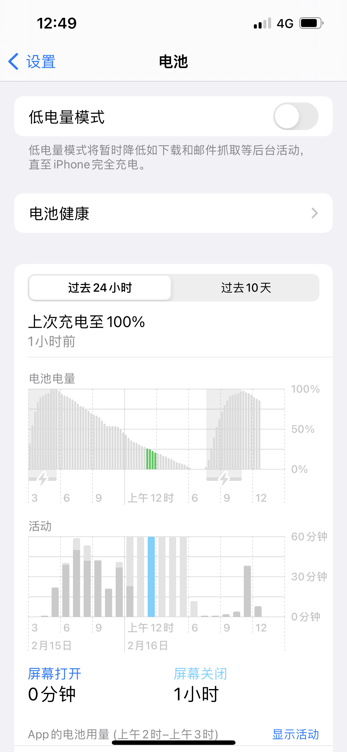 活动的柱状图显示是每个时间段都满了,你可以看看App的电池用量那里是哪个app在使用。