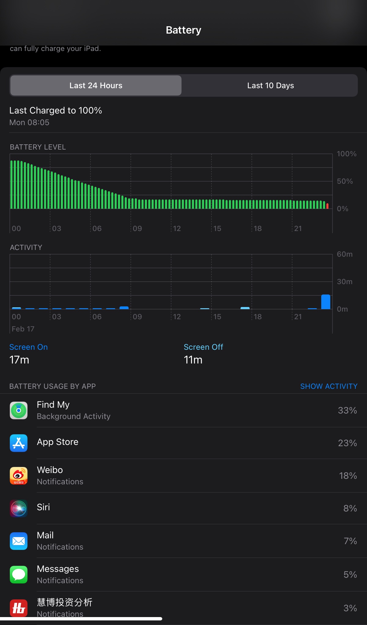 在iPad Pro(2020,蜂窝)长时间待机的情况下(magic keyboard合上),find my在后台耗电严重,并且再次打开后,屏幕界面停留在开机蜂窝网络搜网成功的界面下。