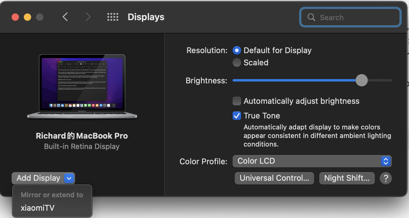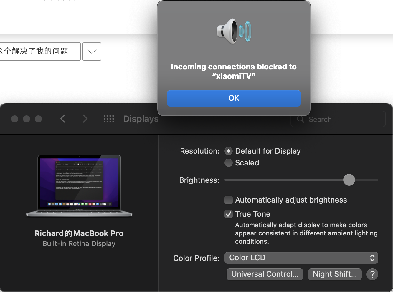 Macbook Pro 2018款,从系统升级到Catalina后出现无法无线投屏,到如今的Montery12.2还是无法无线投屏,电脑买过来的时候无线投屏一直很好用。现在点击投屏设备就会提示“Incoming connections blocked to xxx”。