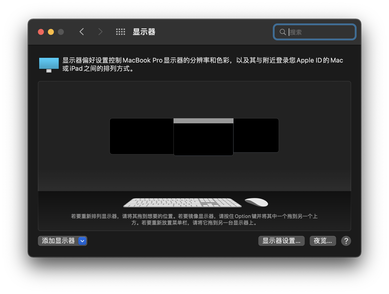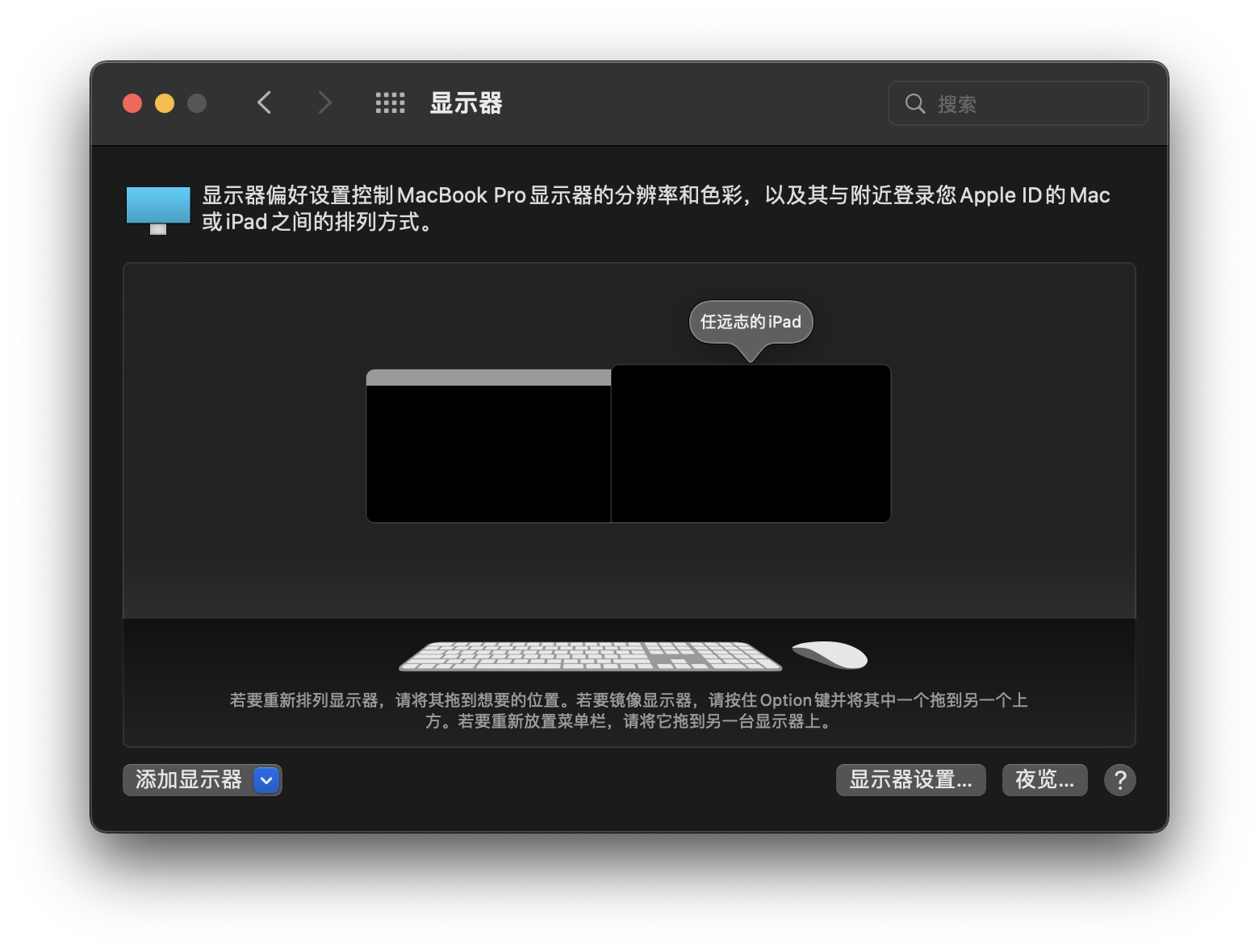 第一幅图,MacBook Pro有线连接了一台显示器作拓展,无线连接一台iPad Pro作拓展,一切正常。iPad Pro在主屏幕右侧。第二幅图,mbp仅无线连接一台iPad Pro,分辨率不正常,且无法人工调节。