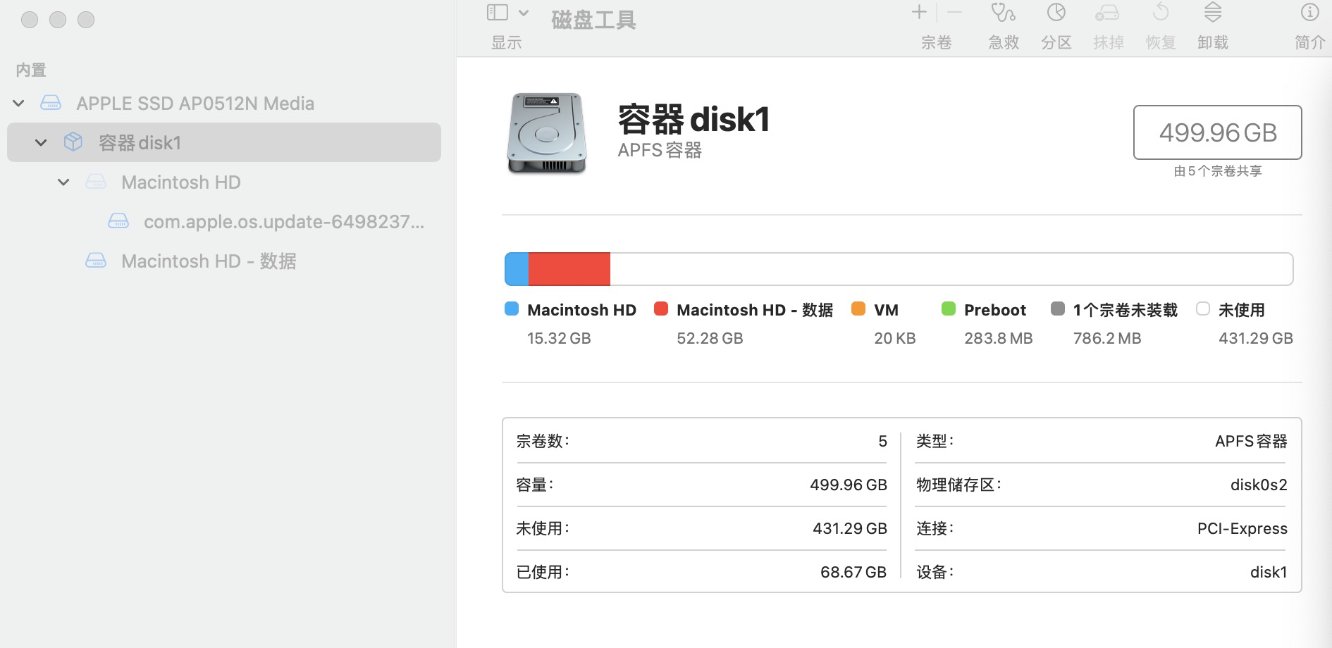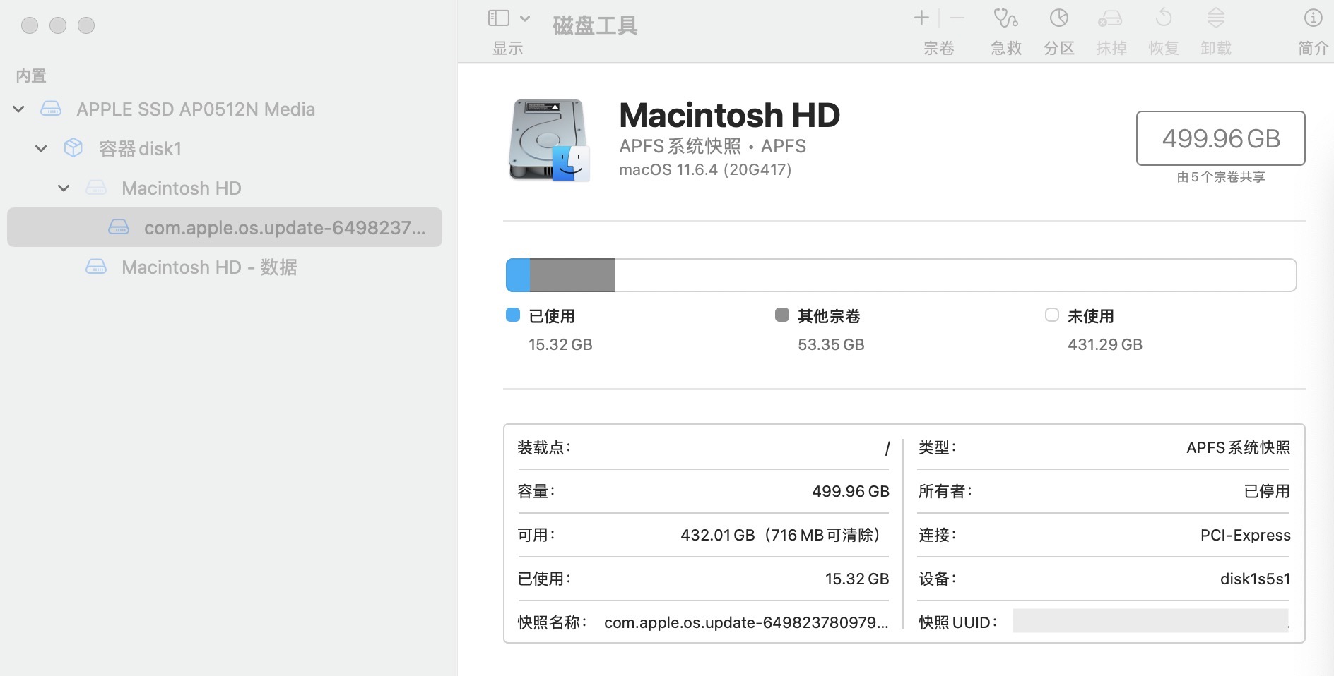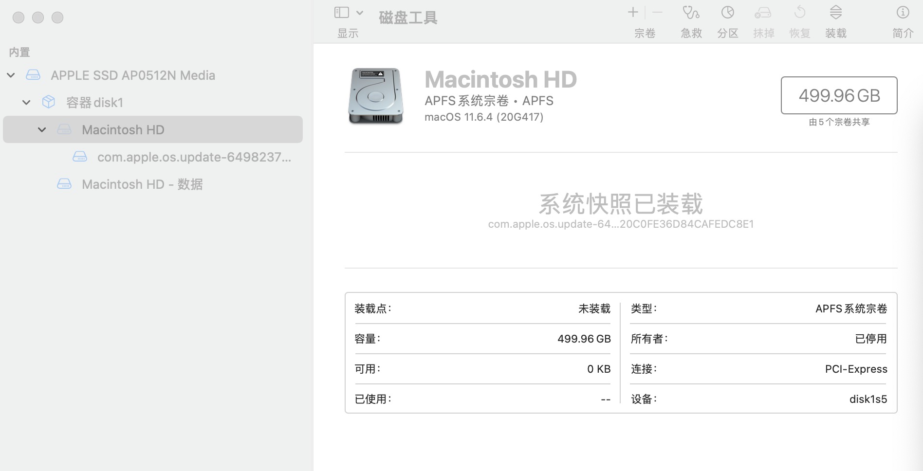 因为启动是使用的 Macintosh HD 的快照(它下面那个),这样防止未授权的对系统盘 Macintosh HD 的修改。